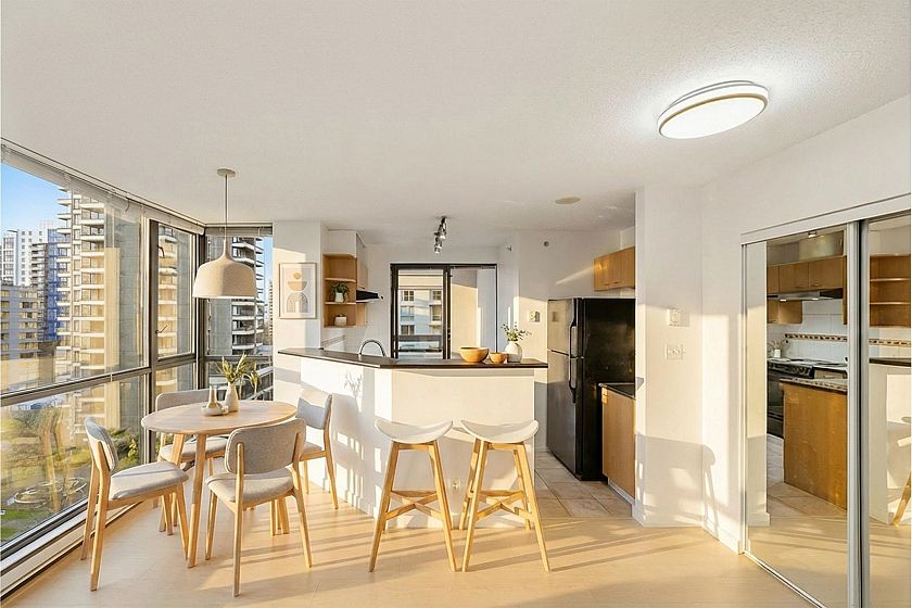 *Bright corner studio in the popular LIONS West Tower*** Spacious SW facing unit with solarium that can be small bedroom/flex space. Efficient floorplan, no wasted space. PRIME downtown location, walk everywhere! Steps to Stanley Park, financial district, Coal Harbour, seawall, shopping & restaurants on Robson Street. Freshly painted, new laminate flooring. Building amenities include 24/7 concierge, party & media room, gym, sauna and guest suites. 1 parking and 1 storage locker included. Ideal for 1st time home buyer or investor! Some photos are virtually staged.