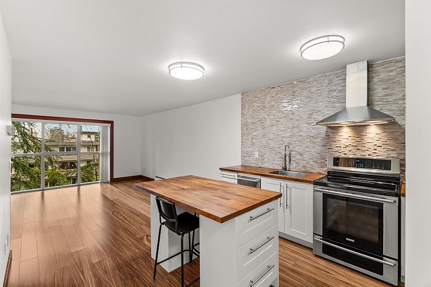 LANDMARK SHAUGHNESSY in the heart of Fairview. Quiet, tree-lined West 13th location just steps to excellent shopping, restaurants, and transit. This gorgeous studio has been renovated with a distinctive, luxurious West Coast style. Gourmet kitchen with stainless steel appliances, large table/breakfast bar, engineered hardwood flooring, new lighting, ceiling, electrical outlets and a fresh, modern feel throughout. The huge living room window frames stunning city and mountain views and fills the home with natural light. Murphy bed included. 1 parking and 1 storage locker. Proactive building: re-piping (2021) and parkade membranes (2019). Call for your private showing! Note: some photos virtually staged.