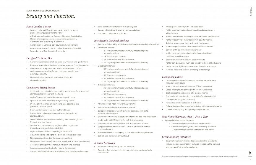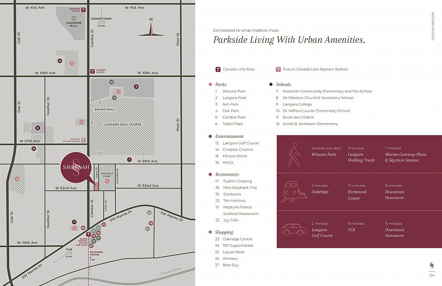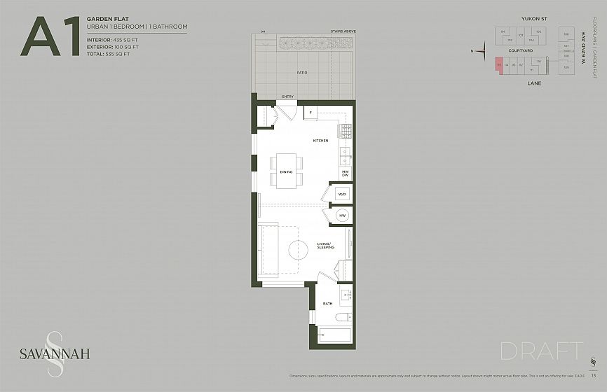 EXTREMELY MOTIVATED! HUGE DISCOUNT AVAILABLE! Savanah Vancouver – 36 Georgian-inspired parkside townhomes & garden flats on Vancouver's Westside Cambie Corridor. This A1 plan urban 1-bed garden flat offers 435 SF interior + 100 SF private patio directly across from Winona Park. Features 9' overheight ceilings, integrated Fisher & Paykel 24" appliance pkg (cooktop, wall oven, fridge/freezer, DW), engineered hardwood floors, quartz countertops & backsplash, crown mouldings, individually controlled A/C & heating, in-suite front-load W/D, and Kohler brushed brass fixtures throughout. Light colour palette. Includes 1 parking stall. Private ground-level entry off quiet Yukon St with parkside views. Steps to Langara Golf Course & walking trails. 7-min walk to Canada Line.