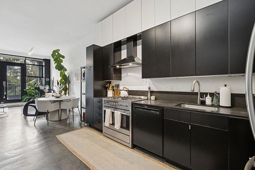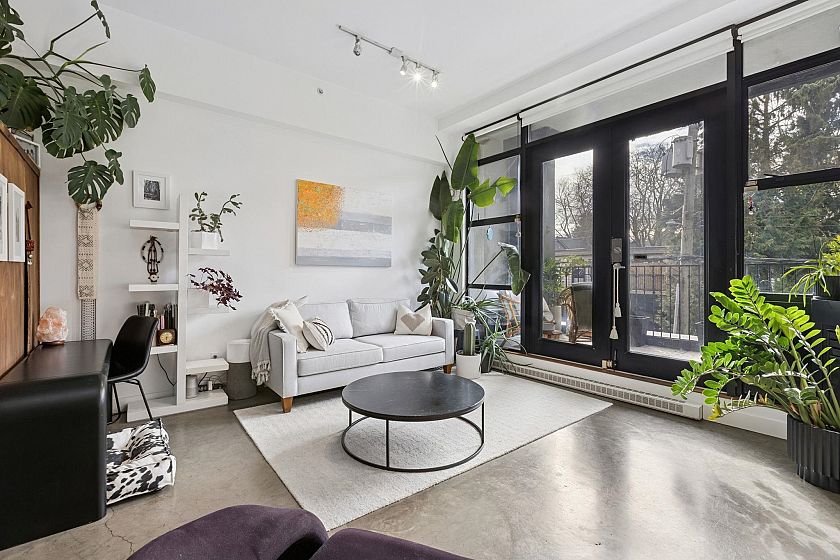 Well-designed, modern studio in Kitsilano’s sought-after Arbutus Walk, quietly positioned on the preferred side of the rainscreened concrete “Metro” building. This open-concept home features soaring 11-foot ceilings and polished concrete floors, with a functional layout that allows for defined living and sleeping areas. The updated kitchen offers stainless steel appliances and ample storage, flowing into a bright living space with a cozy gas fireplace and oversized French doors. Enjoy a large south-facing covered patio for year-round use. Includes in-suite laundry, one large parking stall, and one storage locker. Pets and rentals allowed. Steps to shops, cafes, parks, beaches, Arbutus Greenway and the new Broadway–Arbutus SkyTrain.