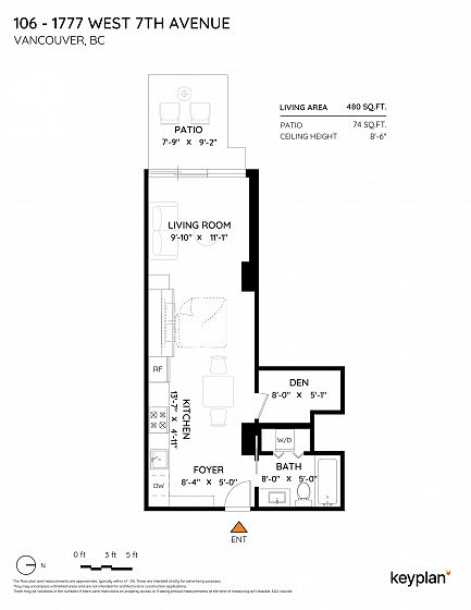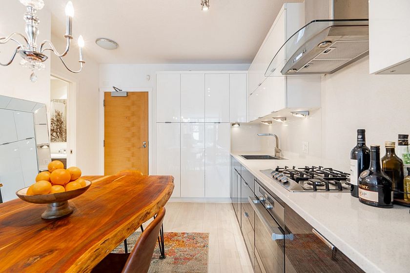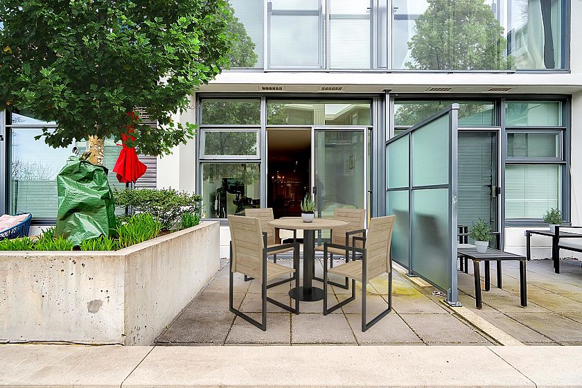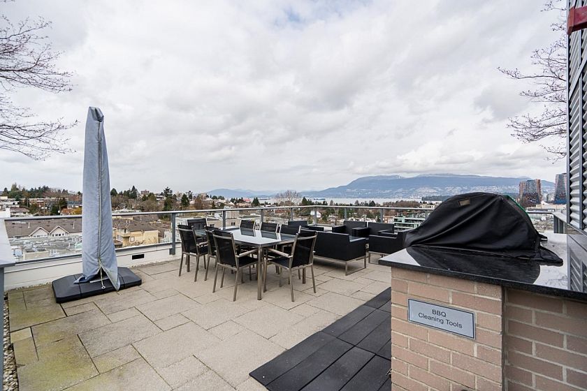 Welcome to KITS360! This bright open-concept studio offers 480 sqft of interior living and a spacious patio overlooking a tranquil water fountain and the quiet courtyard gardens. Upgraded wood floors, custom wall bed and a den currently configured as a walk-in closet with California Closets for maximum efficiency. Sleek kitchen with stainless steel Miele appliances and gas cooktop, plus a spa-inspired bathroom and in-suite laundry. Luxury concrete building with impressive rooftop terrace with BBQ, concierge, gym, courtyard and media room. Prime Kits/Fairview location near transit, cafes, shopping, UBC and Downtown. 2 parking (tandem) and storage locker included. A perfect starter home, investment property or stylish pied-à-terre! Open Houses: Sat April 25th, 2-4pm.