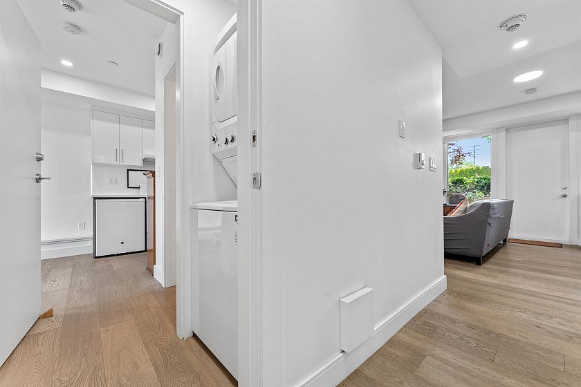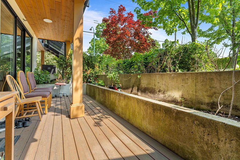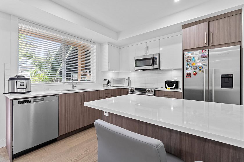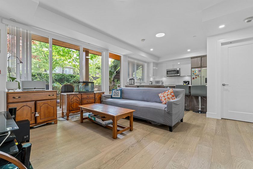 3 BR 3 bath one level townhouse with 2 exterior entrances. Use all 3 BR’s yourself or rent out the self contained legal 1 BR suite with private exterior entrance and private shared laundry between the 2 units. This home is very well kept, shows nicely, high ceilings, 3 outdoor ground level patios, 3 storage bins, 1 cat or 1 dog any size ok. Strata bylaws do not prohibit short term rentals
