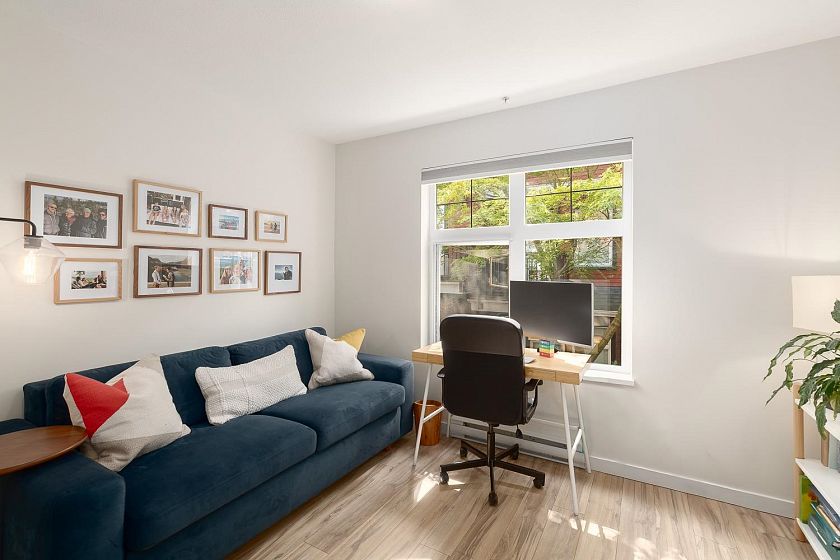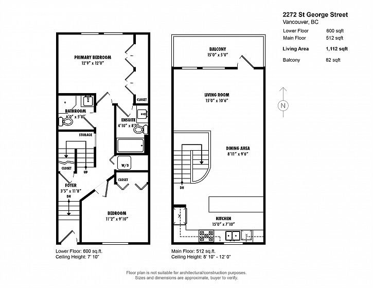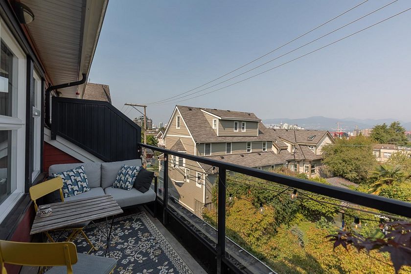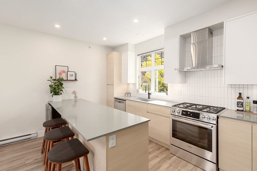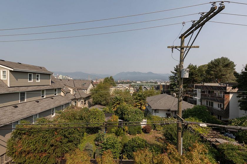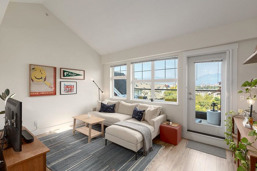 Welcome to this 2-bed, 2-bath townhome at The Vantage, a highly sought-after boutique complex in Mt. Pleasant, with unobstructed views of the North Shore mountains. The upper level is designed for entertaining with open living/dining, vaulted ceilings, and a kitchen fully redone in 2021 with Fisher & Paykel + Bosch appliances, extended island, and a gas stove. A skylight brings natural light year-round, while the patio extends the living space outdoors. On the main level, the primary bedroom offers a luxurious ensuite, along with a second bedroom, full bath, laundry, and under-stair storage. With one parking stall and two storage lockers, this turnkey home offers a perfect blend of modern living and everyday functionality. Across the street from Mt. Pleasant Elementary, and Guelph park.
