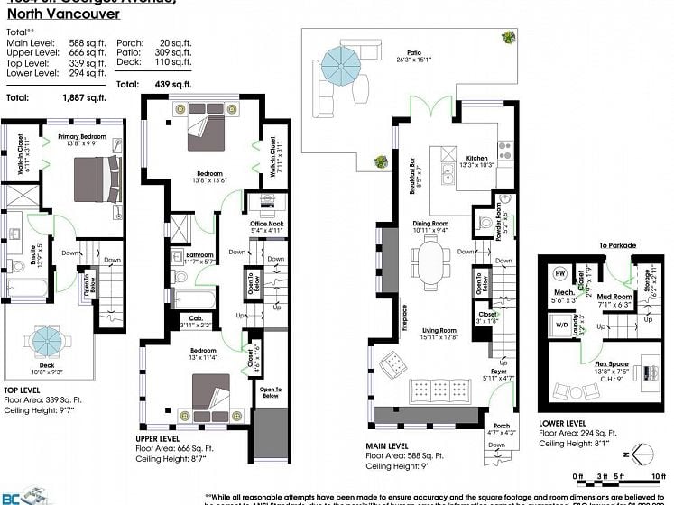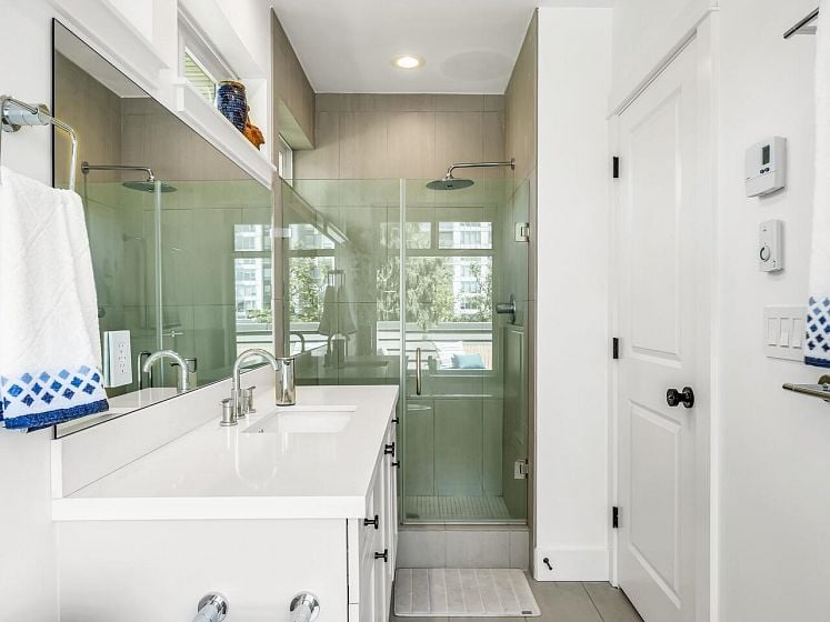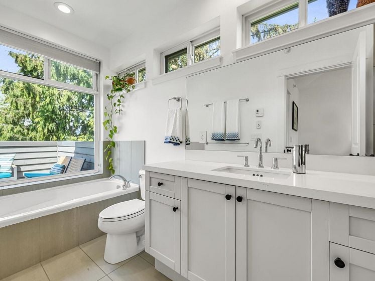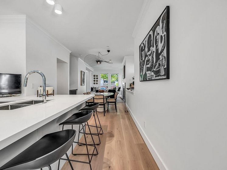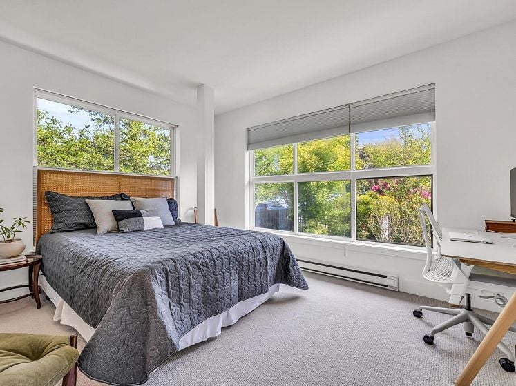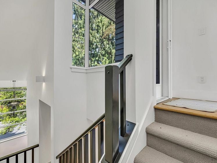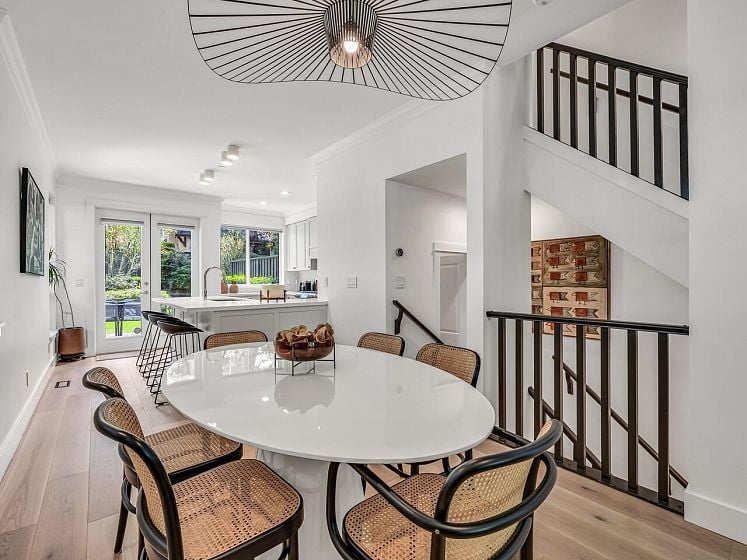 Have the best! This fully updated townhouse has it all and a backyard! Boutique 8 unit building in an ideal Central Lonsdale location with everything at your fingertips. 1887 Sq Ft of totally transformed house sized open concept living. Dramatic double height entry, Great Room enhanced by high ceilings, large windows, stunning marble gas fireplace & hardwood flooring. Custom designer kitchen w/SS appliances, quartz counters and eat at island. French doors leading to the private "oh so hard to find" fenced backyard! Up offers 3 generous bdrms incl a stately primary suite on its own level with patio for the ultimate in privacy! Featuring vaulted ceilings, W-I closet and spa-like ensuite. Lower level features flex room, laundry & access to secured 2-car garage.