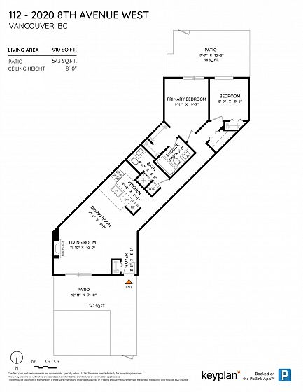 W/ its own private entry, 2-beds, 2-baths, & two patio, this ground floor unit boasts a highly functional open-concept layout with 910 sqft of interior space, + 543 sqft of outdoor space. Updated throughout, w/ wide-plank flooring & sophisticated finishings. The bright kitchen features sleek cabinetry, S/S appliances, & breakfast bar. The living room includes floating shelving, gas F/P, & sliding doors leading to the front patio & providing seamless integration of indoor/outdoor living. The generous primary bed offers a walk-through closet, spa-like ensuite, & sliding doors to the rear S-facing patio. The secondary bed & bath are similarly well appointed. Includes ample in-suite storage, in-suite laundry, patio storage shed & U/G parking.