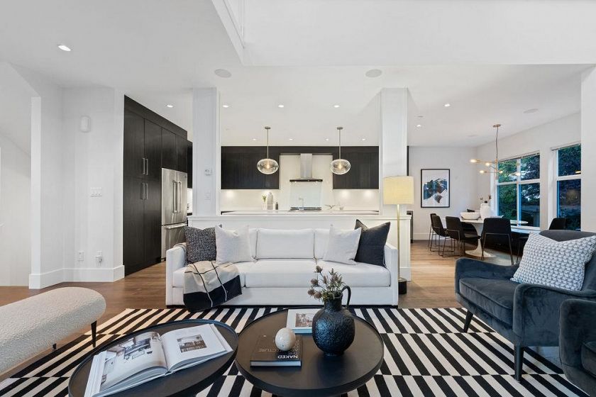 A completely redesigned FOUR bedroom + office, 4 bathroom duplex-style townhouse offering nearly 3,000SF of thoughtfully curated living. Soaring vaulted ceilings, skylights & wide plank hardwood floors enhance the open concept main floor, French double doors leading to a large PRIVATE fenced yard w/ built-in Weber BBQ island. Chefs kitchen fts. 10-ft quarts waterfall entertainers island, black oak cabinetry, ample storage, Jennair S/S appliances & a built in banquette. Stunning steel+glass staircase leads to 3 light filled bedrooms & an impressive primary suite with lofted office, vaulted ceilings, walk-in closet & ensuite w/ soaker tub, walk-in shower, double vanity and in-floor heat. Lower level includes a media room, gym, & a fully finished nanny suite w/ separate entry & 2 car garage.