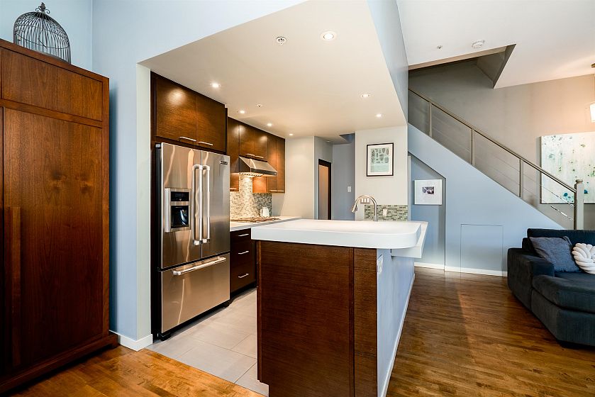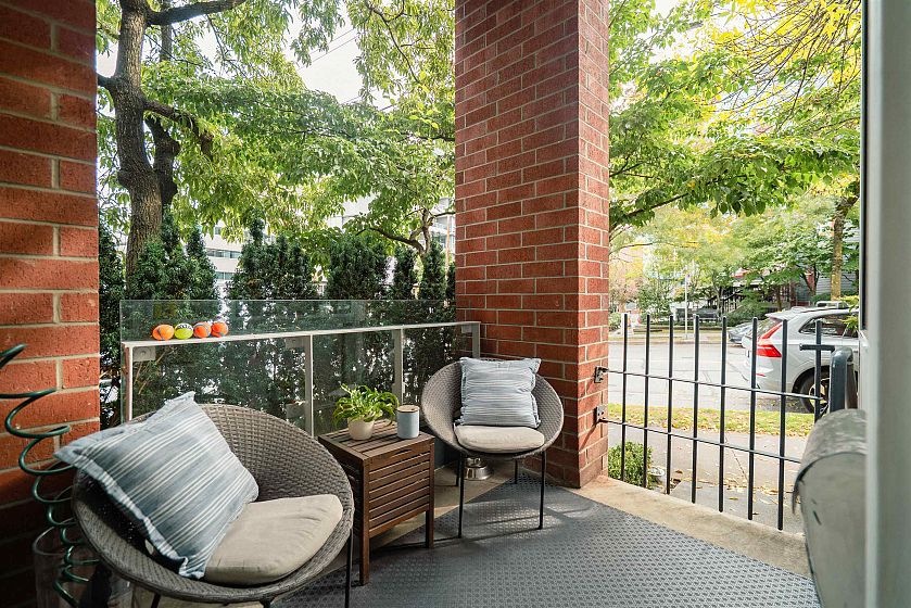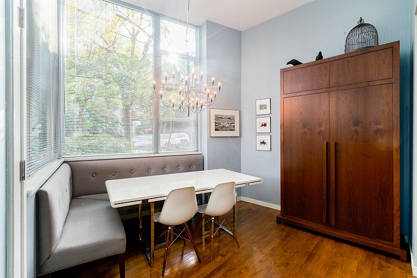Come see this absolute gem! Rarely available turret-style townhome with your own private entrance at The Omega! Situated in the heart of popular Fairview, this bright, northeast corner residence features soaring 11' ceilings, dramatic floor-to-ceiling windows+ a super spacious open-plan design. The main level includes a curved living room wall, gas fireplace, open kitchen with stainless steel appliances, separate dining area, powder room for guests+ mudroom/pantry. Upstairs offers a king-sized primary with deep closet+ ensuite, a generous second bedroom+ a 3-piece bath with walk-in shower. Amazing, community-focused, friendly neighbourhood+ just steps to Whole Foods, the Seawall, Granville Island, transit+ a quick zip by train to YVR.