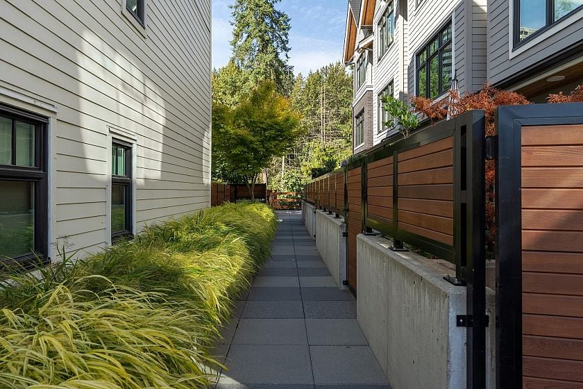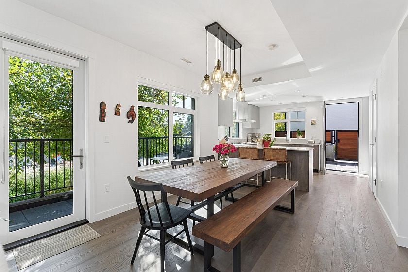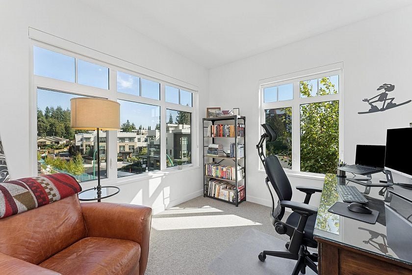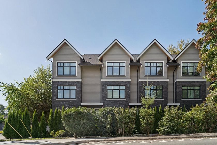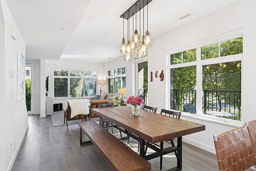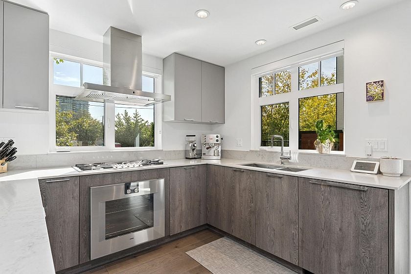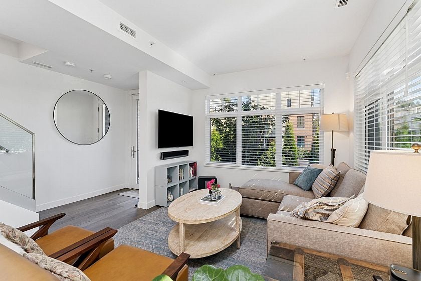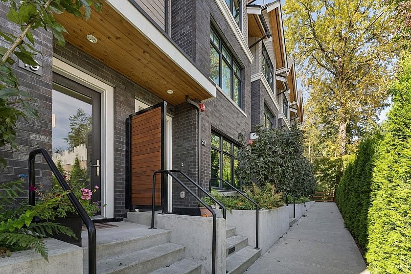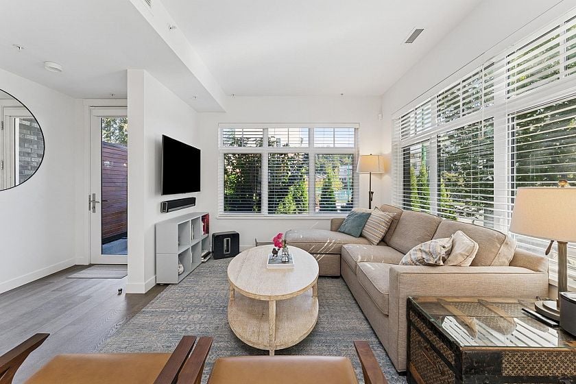 Located in 'Holland Row', a boutique riverfront community in Lions Gate Village, this 4-bed, 3-bath end-unit townhome offers 2,046 sqft across 4 bright levels. Just 5 yrs old & feels brand new, with the space of a detached home & ease of rowhome living. Main level features open living, engineered oak floors, chef’s kitchen w/ quartz counters, Gaggenau appliances, bistro balcony & terrace. Upstairs has 2 beds, 5-pc bath & full laundry rm. Top floor primary retreat w/ walk-through closet & spa-like ensuite. 4th bed is ideal home office. Entry level offers mudroom, pantry & private garage w/ EV charger + 2nd stall. Feats: A/C, 9' ceilings, blackout blinds, smart thermostat. Steps to trails, rec centre, daycare, Park Royal & Ambleside. Easy access to DT & Hwy 1.