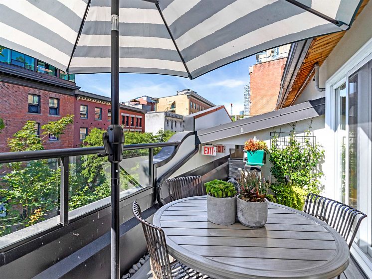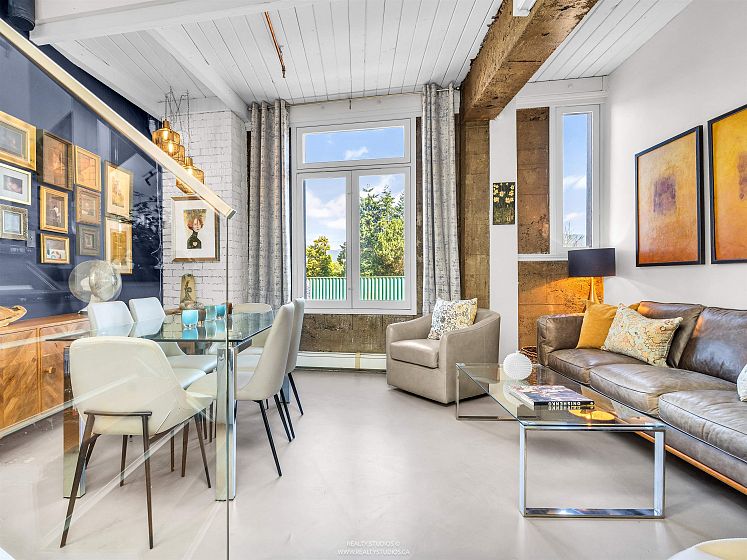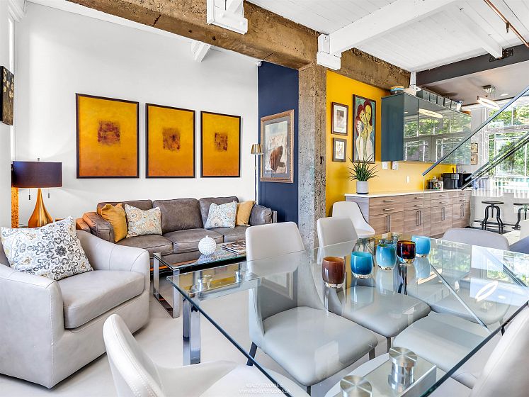 Rarely available, this distinctive 2 bed, 2 bath + office + sunroom townhome in Gastown is a true character residence — a 1993 heritage conversion of a 1926 warehouse blending industrial charm with modern sophistication. Spanning five levels, this urban loft-style townhome features original hardwood floors, exposed brick and concrete, an updated kitchen, skylight, gas fireplace, and rooftop decks with panoramic mountain, ocean, and city views. Thoughtfully maintained with new patio doors and paint (2025), resurfaced floors (2024), glass railings (2021), boiler (2019), kitchen (2018), and more. Ample storage, pet and rental friendly. Ideally located on one of Gastown’s most sought-after blocks, steps from cafés, restaurants, and boutiques.