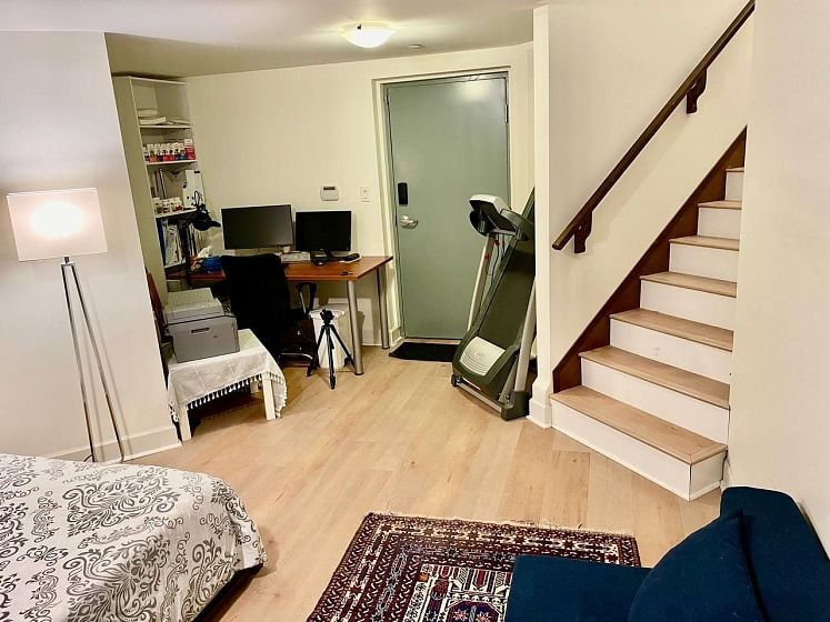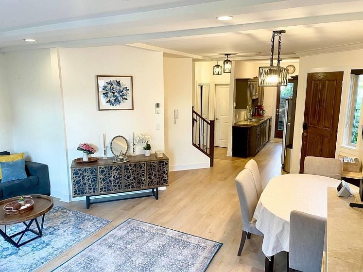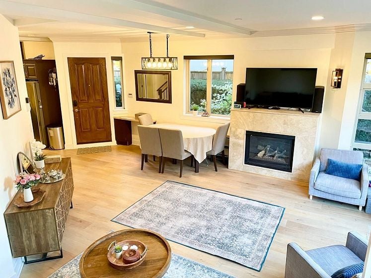 Private Separate entry , boutique style unit . This rare corner home stands out as the best unit in the complex, offering a private entry that delivers a true single-family home feel. an expansive, sun-drenched wraparound south-facing terrace with natural light throughout. Featuring 3 bedrooms and 2.5 bathrooms, all bedrooms are thoughtfully located on the same level, each with generously sized closets. The primary suite includes a private ensuite bath. Downstairs, enjoy a spacious recreation room complete with a built-in queen-size Murphy bed – perfect for guests or to be considered as a fourth bedroom. German waterproof laminate flooring throughout, a Miele dishwasher and LG fridge. Comes with 2 secure underground parking stalls and a large private storage room. High Ceiling 9 4"