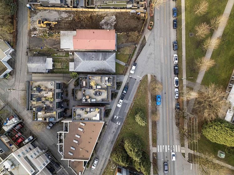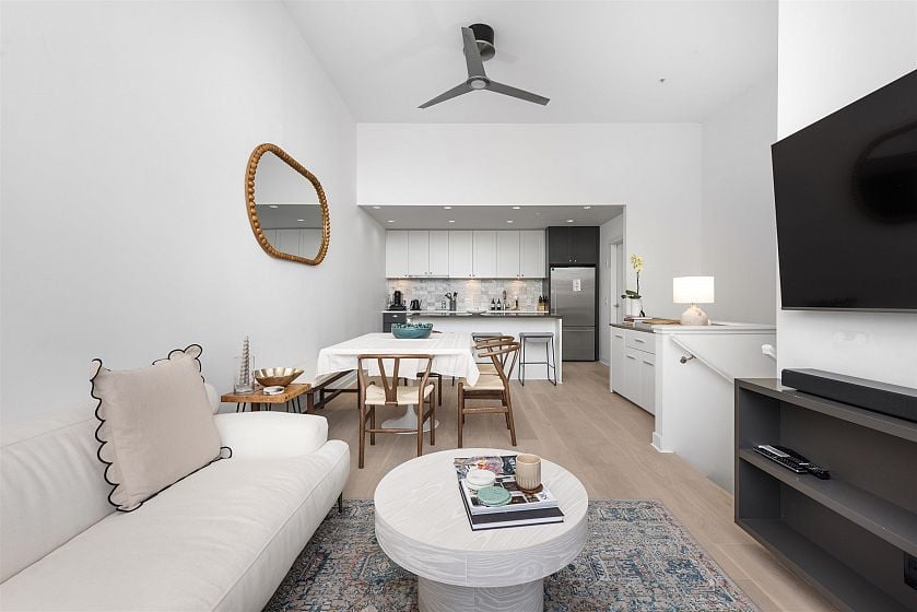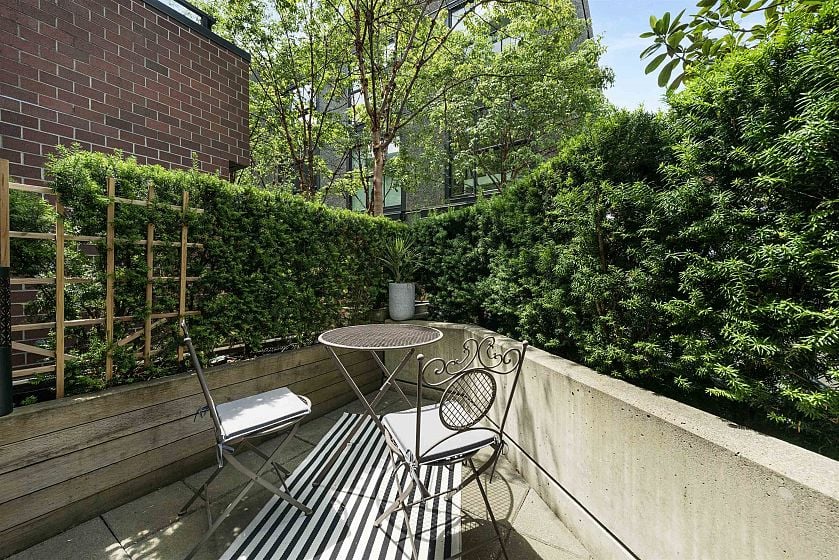Welcome to Mason by Boffo, a boutique collection of modern townhomes located across from Trout Lake Park. This bright, stylish home features private street entry, soaring 12-foot ceilings, oversized windows, and open-concept living. The sleek kitchen includes quartz counters, marble tile backsplash, matte lacquer cabinets, and premium appliances. Enjoy a sun-soaked west-facing patio off the primary suite and a second bedroom with space for a home office. Updates include new hardwood floors throughout, custom built-in closets, and a new hot water tank. Includes one secure parking stall, storage locker, and bike storage. Steps to Trout Lake, trails, Commercial Drive, and SkyTrain. A must-see!