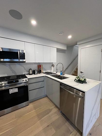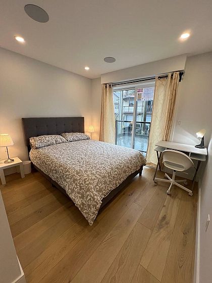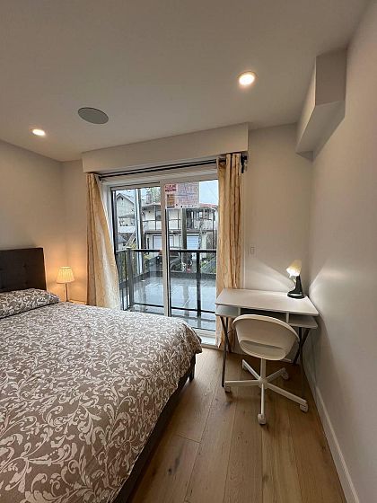 East Vancouver single unit in tri-plex . Quality built. It is a 2 storey unit on the Rear side, Detached. Features include beautiful, engineered hardwood flooring throughout, glass railings to further enhance the open feel, vaulted ceilings, shared stacker laundry, open concept kitchen and formal area with luxury finishes. Main floor layout offers kitchen with marble counters, smooth arborite cabinets, and 2pc bath. Upper floor offers , primary bedroom with 3pc ensuite. and 2 other bedrooms??with a 4 pc bathroomThe home has all the modern connections; radiant in-floor heating, smart home technology, tankless hot water, A/C. The unit is rented to 3 separate tenants each with dedicated bedrooms.