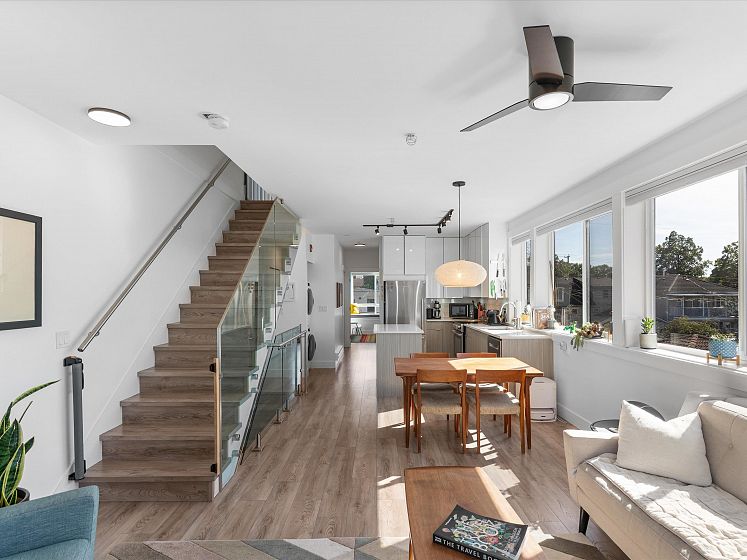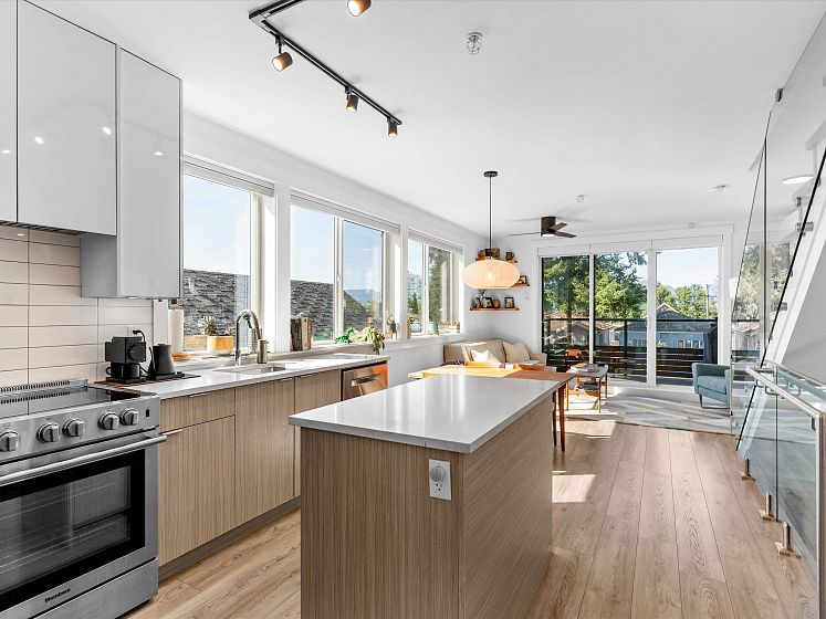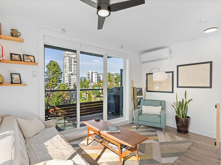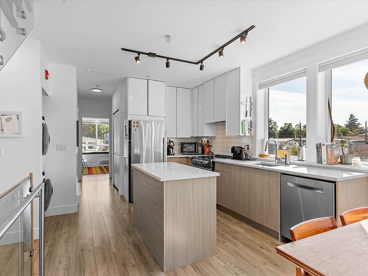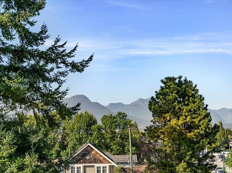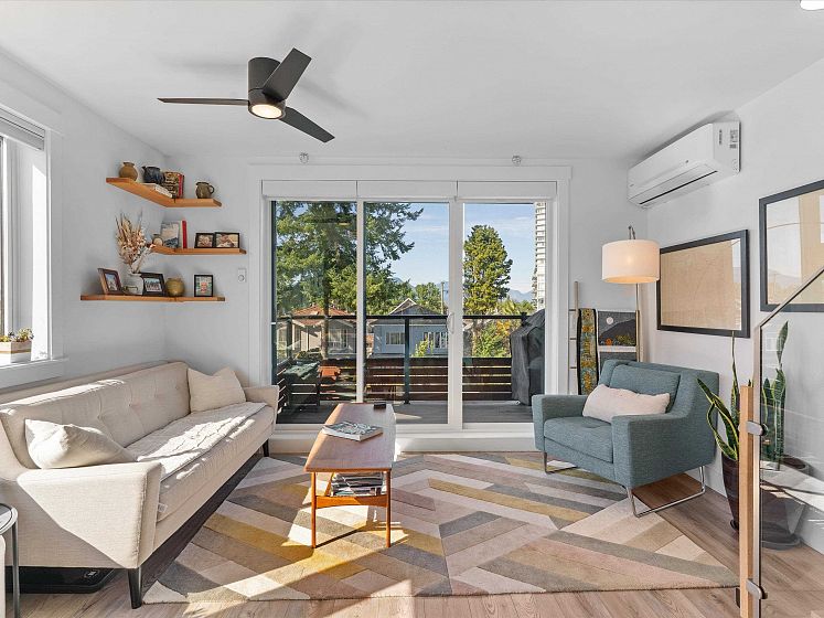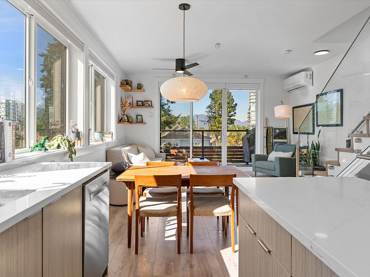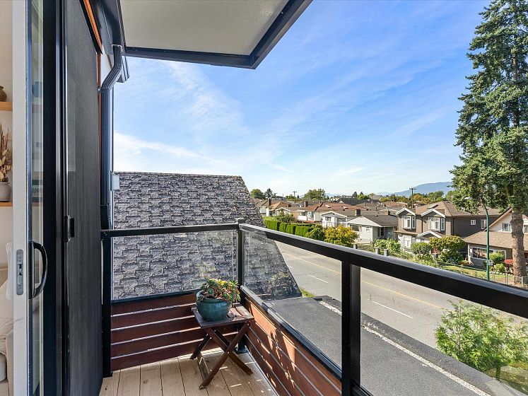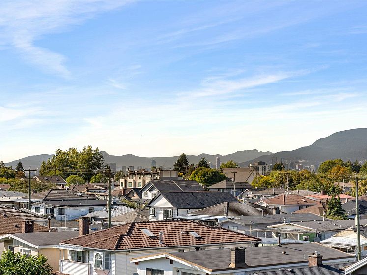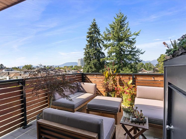 Gorgeous, modern & sun-filled 3 bedroom townhouse with 300sqft of outdoor space and a heat pump for A/C! This home has a spacious 1,200sqft floor plan with plenty of windows featuring mountain views yet privacy from the neighbours. The main floor offers an excellent kitchen with tons of storage, dedicated dining space & large living room with a BBQ balcony. You'll also find a large primary bedroom, full bathroom & flex space for storage or a home office. Upstairs is 2 bedrooms, 2nd bathroom & 2 large roof decks: one facing south + one facing NW for incredible mountain views. Extra features include storage lockers, dedicated parking, window blinds & low strata fees! Walking distance to the Skytrain, Kingsway, schools, parks and tons of amenities. OPEN HOUSE Sat/Sun Nov 8/9 from 1-3pm!