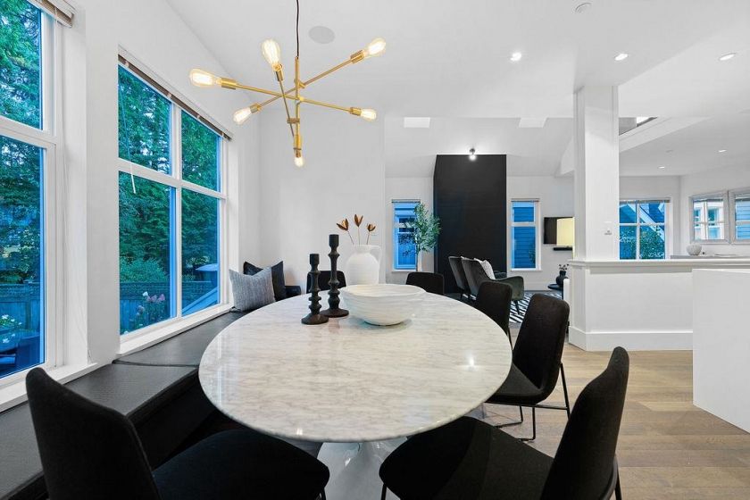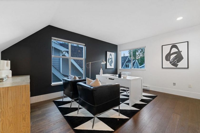 A completely redesigned FOUR bedroom + office, 4 bathroom duplex-style townhouse offering nearly 3,000SF of thoughtfully curated living. Soaring vaulted ceilings, skylights & wide plank hardwood floors enhance the open concept main floor, French double doors leading to a large PRIVATE fenced yard w/ built-in Weber BBQ island. Chefs kitchen fts. 10-ft quarts waterfall entertainers island, black oak cabinetry, ample storage, Jennair S/S appliances & a built in banquette. Stunning steel+glass staircase leads to 3 light filled bedrooms & an impressive primary suite with lofted office, vaulted ceilings, walk-in closet & ensuite w/ soaker tub, walk-in shower, double vanity and in-floor heat. Lower level includes a media room, gym, & a fully finished nanny suite w/ separate entry & 2 car garage.