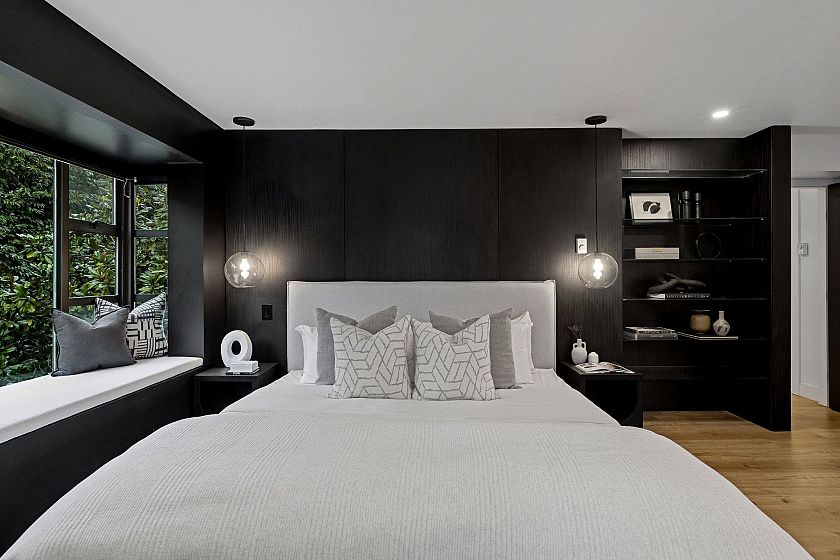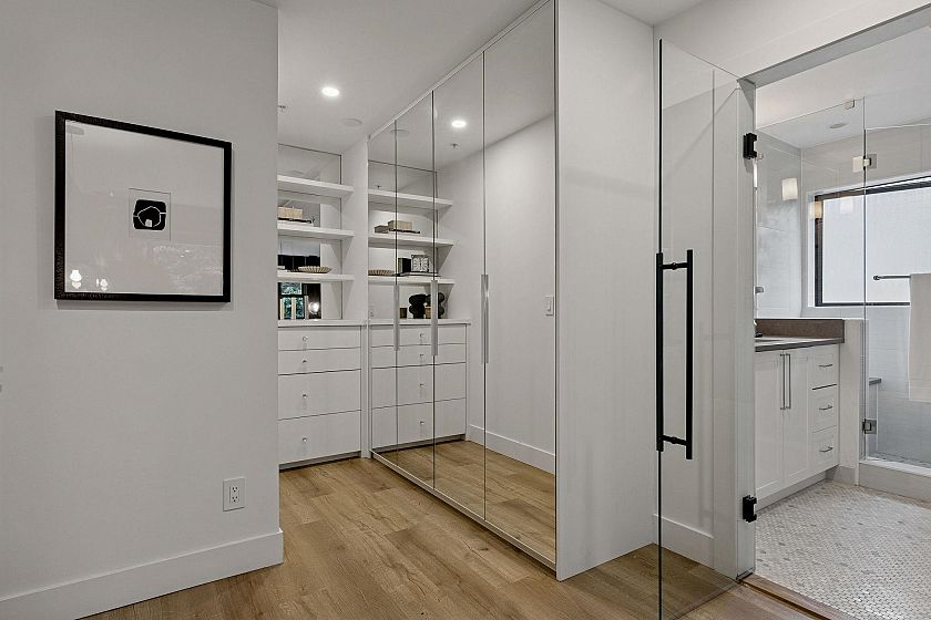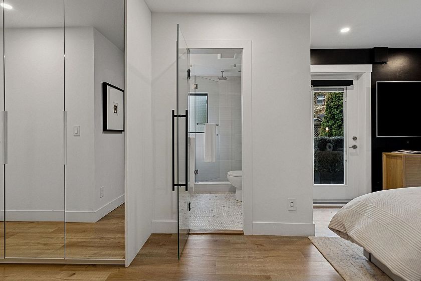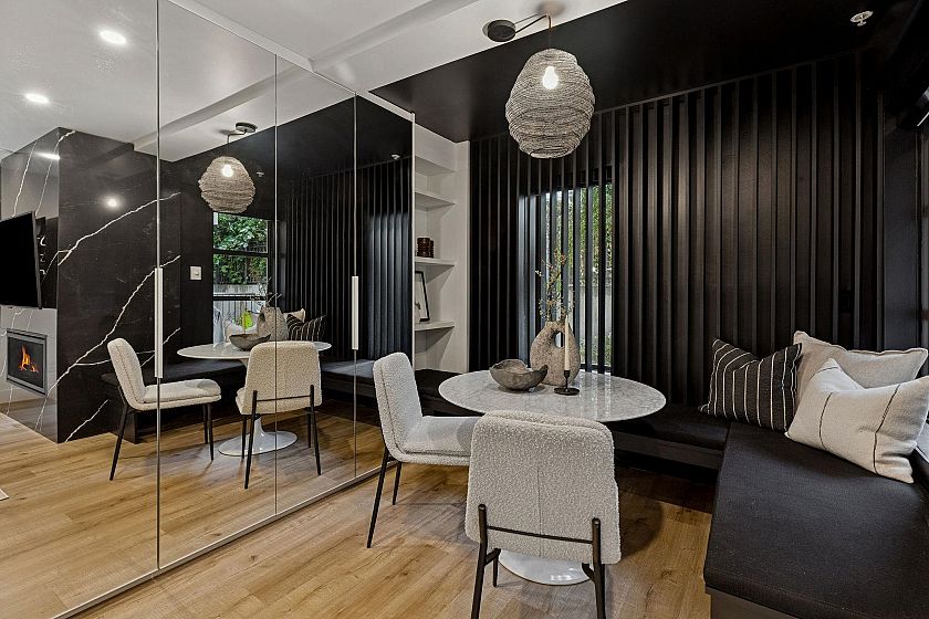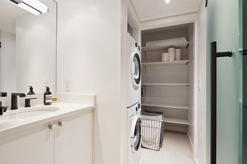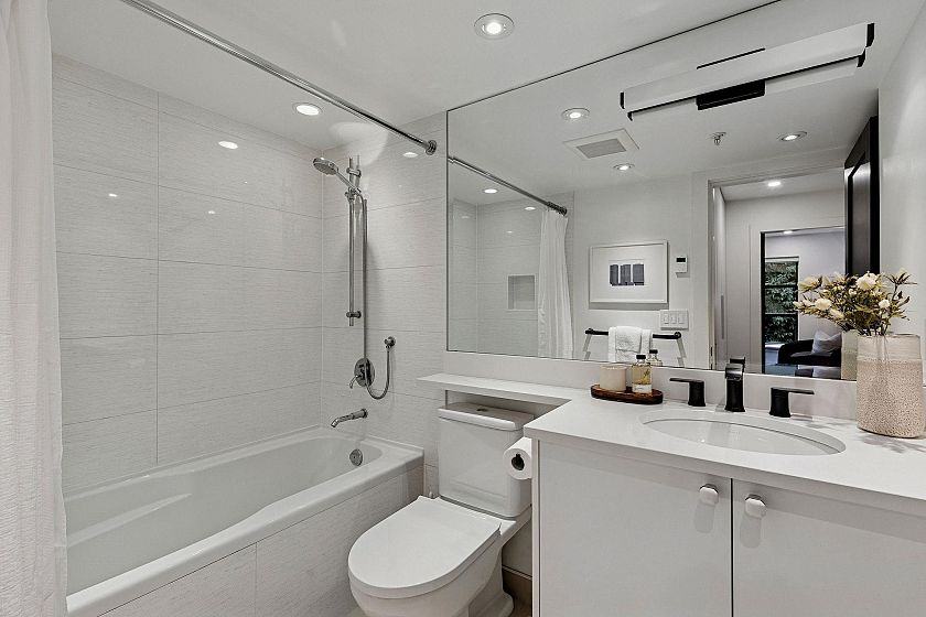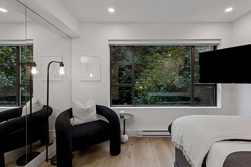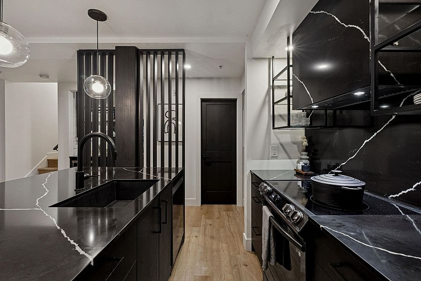 A true standout in the heart of Kits--professionally designed 2 bed+den, 2.5 bath modern corner townhome spans 2 levels, where bold architectural design meets elevated contemporary living+ a 400SF private landscaped backyard, 2 parking and a storage unit! Custom black interior highlights incld, oak privacy screens, Marquina quartz throughout, oak serving bar, built-in banquette dining & ample storage. Kitchen fts. oak flat panel cabinetry Samsung & Bosch integrated appliances, matte black sink&faucet, Marquina quartz waterfall, wrapped hoodfan & a statement per room showcases a live green moss wall & full height mirrors. Two S facing bdrms up w/ a laundry room. A large primary suite w/ custom millwork, bay window, private balcony & ensuite fts carrera marble penny tile flooring w/ NuHeat.