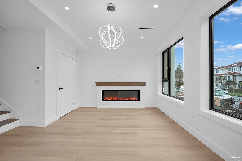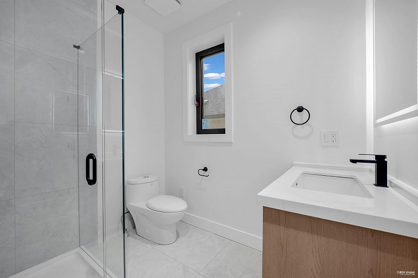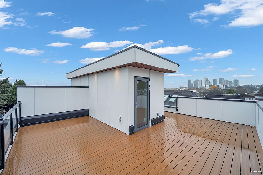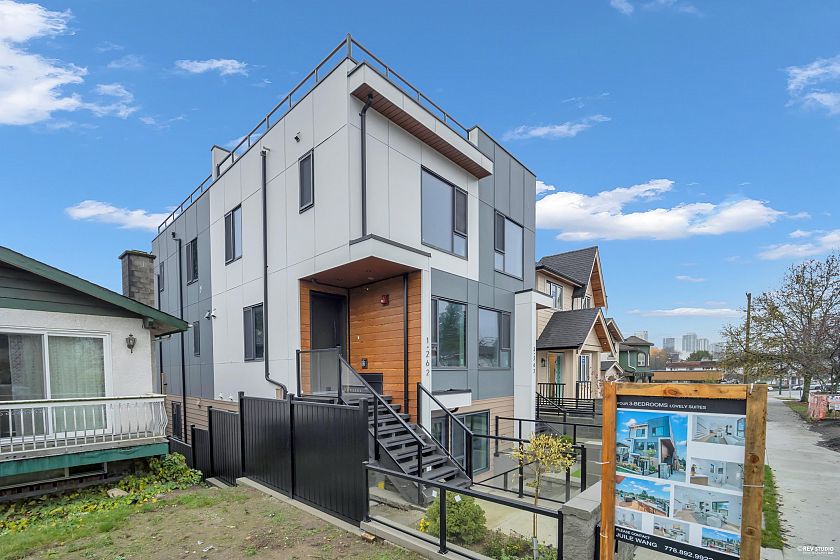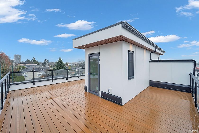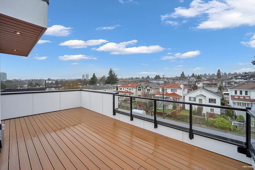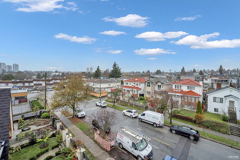 Modern 3 BDRM/2.5 BATH unit in a premier 4-plex, combining style, comfort & convenience. Only 1 min walk to bus stop w/direct access to Skytrain & Vancouver waterfront, 5 mins walk to restaurants & Canadian Superstore. Contemporary design features clean lines, open-concept layout, triple-glazed metal frame windows & energy-efficient systems. Enjoy private yard, alarm, sprinkler & security cameras with back lane access open parking with EV Charging. Inside: gas stove, heat pump (heating/cooling) & 450sqft rooftop patio w/ unobstructed city & mountain views. No Strata Fee!
