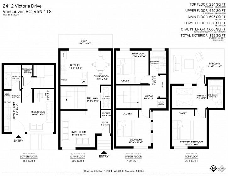 Introducing V8 Townhomes — a boutique collection in the vibrant Grandview Woodland neighbourhood, perfectly positioned at East 8th Avenue and Victoria Drive. This brand-new 3-bedroom, 4-bathroom residence showcases a gourmet kitchen with integrated Fisher & Paykel appliances, white oak engineered hardwood flooring, and premium Riobel and Kohler fixtures. Enjoy multiple outdoor spaces, including private balconies and a rooftop deck. The home also features a legal lock-off suite—ideal as a mortgage helper or guest accommodation. Thoughtfully designed and built with style in mind, V8 offers exceptional value. Just steps to the SkyTrain, Commercial Drive, bus routes, restaurants, and grocery stores, this is connected urban living at its finest.