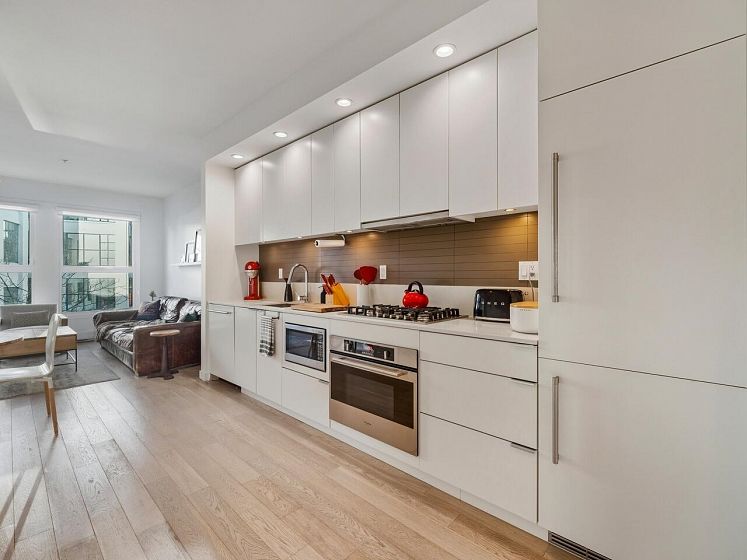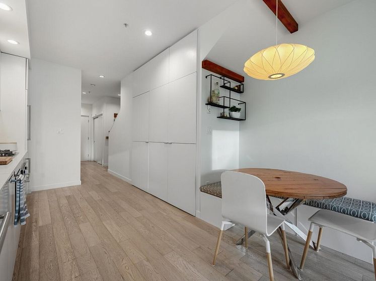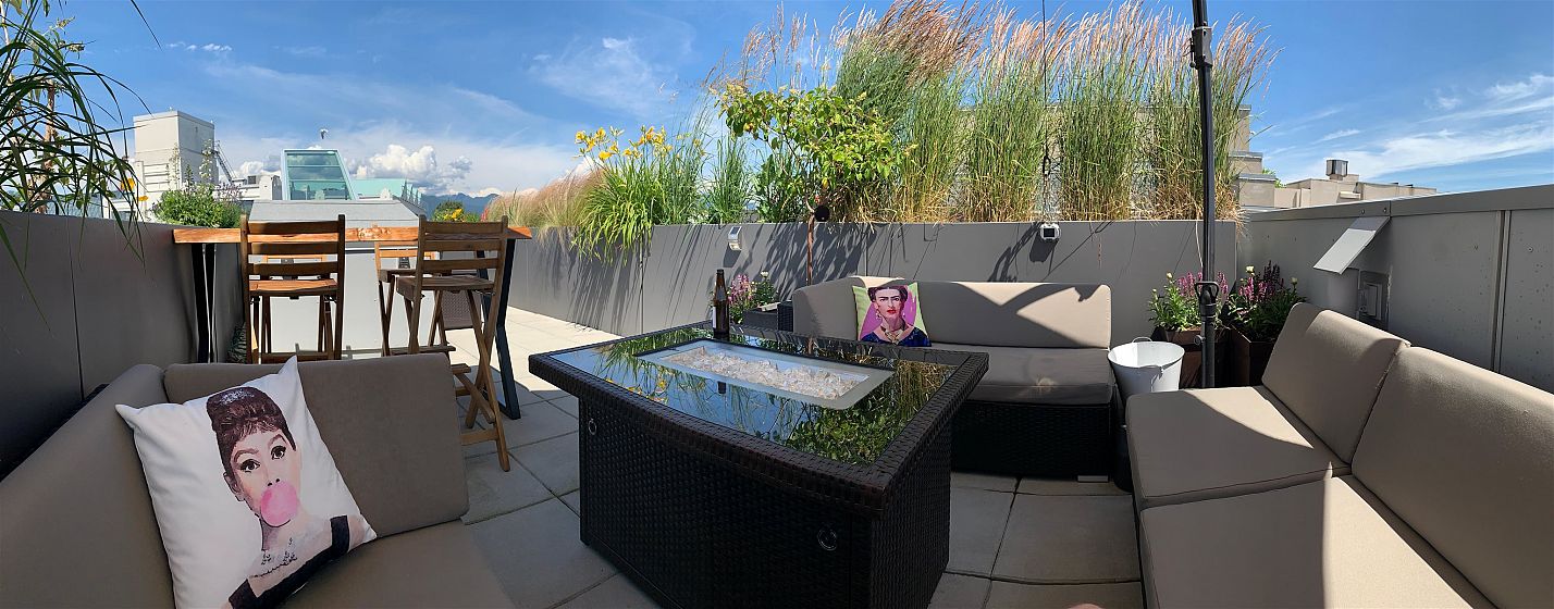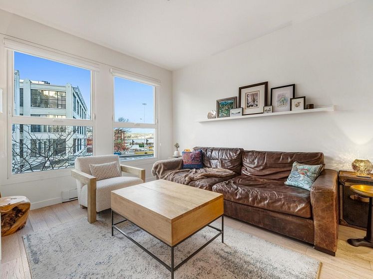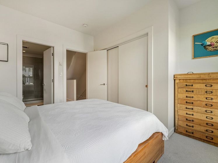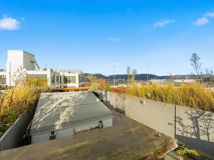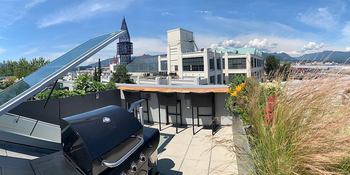 Rare elevated townhome w/ private rooftop patio in the heart of Railtown. This bright 2 bdrm + den, 3 bath loft-style home offers over 1,100 sqft across two levels with 9ft ceilings, abundant natural light, and a quiet courtyard-facing position (not street level). Functional layout features kitchen, living & den on the main, with bedrooms & baths above for ideal separation. A standout feature is the expansive ~400 sqft private rooftop patio with gas hookup, water, and stunning city, mountain & water views—perfect for entertaining from sunrise to sunset. Freshly painted with hardwood floors, gas range, generous storage, 1 parking & 1 locker. Pets & rentals allowed in a boutique, well-kept community with shared courtyard & BBQ. Steps to Gastown, Strathcona, dining, breweries & transit.