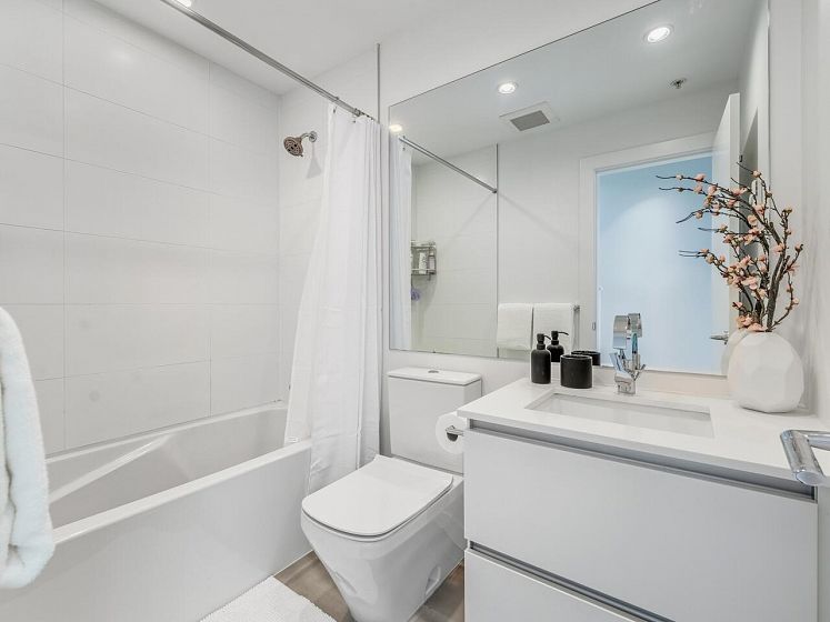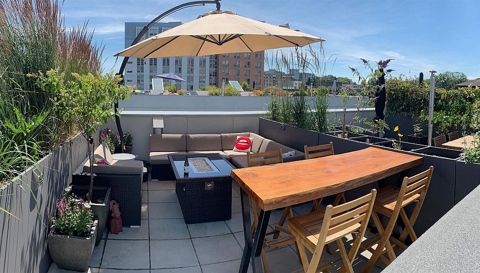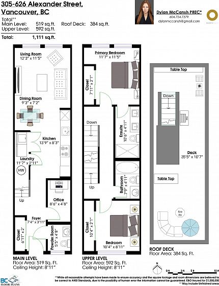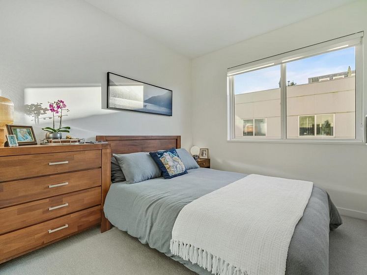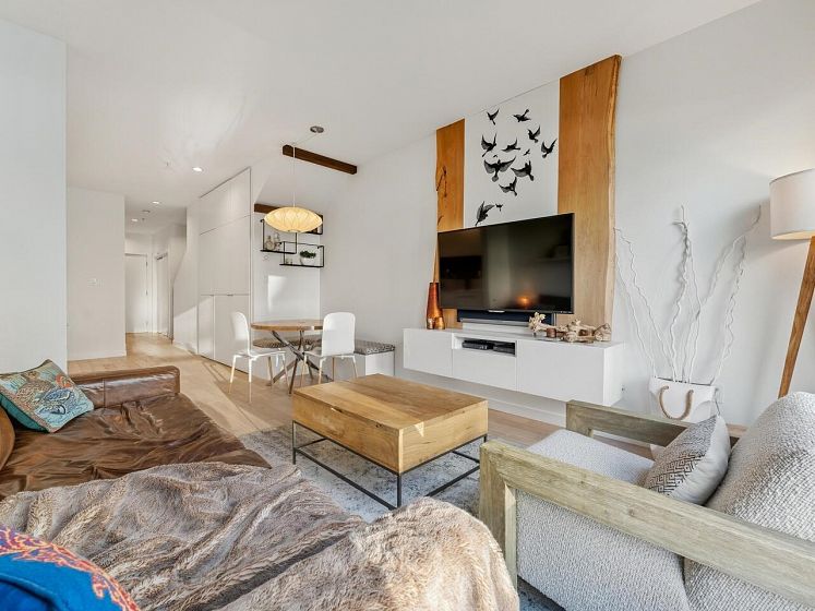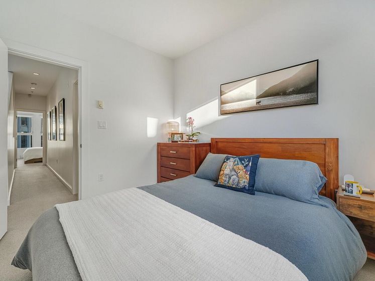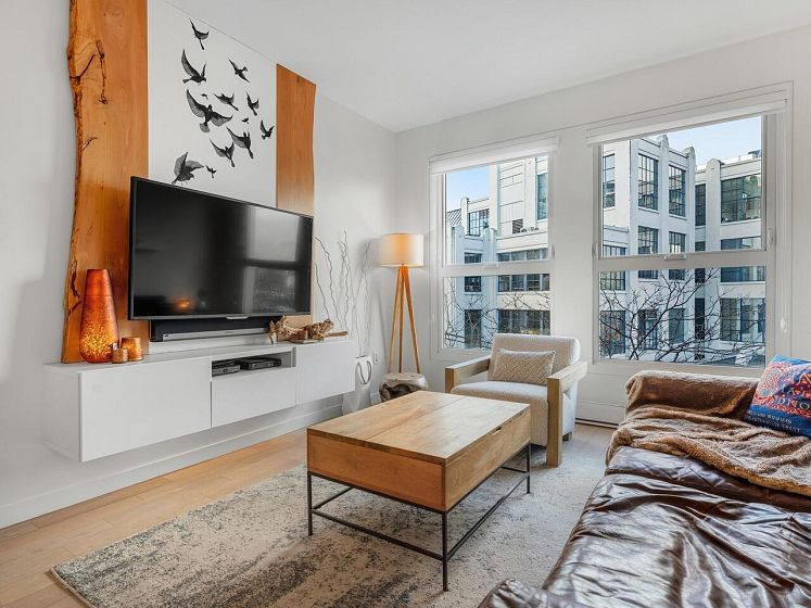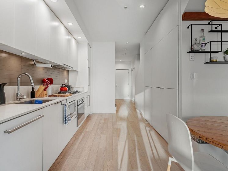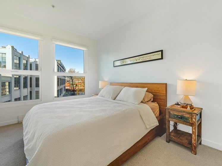 Rare elevated townhome w/ private rooftop patio in the heart of Railtown. This bright 2 bdrm + den, 3 bath loft-style home offers over 1,100 sqft across two levels with 9ft ceilings, abundant natural light, and a quiet courtyard-facing position (not street level). Functional layout features kitchen, living & den on the main, with bedrooms & baths above for ideal separation. A standout feature is the expansive ~400 sqft private rooftop patio with gas hookup, water, and stunning city, mountain & water views—perfect for entertaining from sunrise to sunset. Freshly painted with hardwood floors, gas range, generous storage, 1 parking & 1 locker. Pets & rentals allowed in a boutique, well-kept community with shared courtyard & BBQ. Steps to Gastown, Strathcona, dining, breweries & transit.