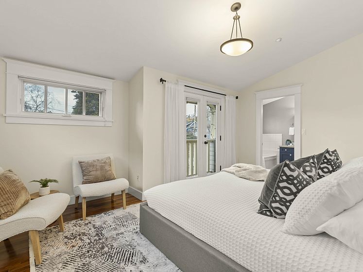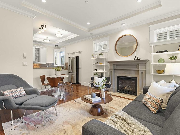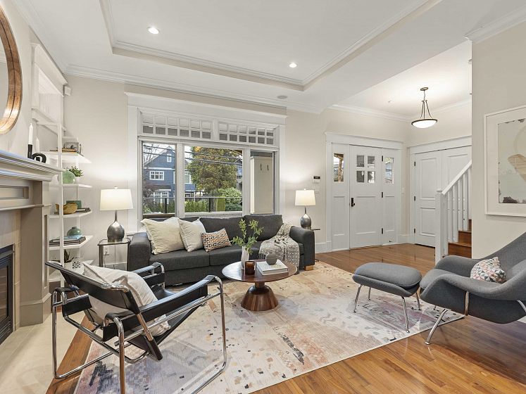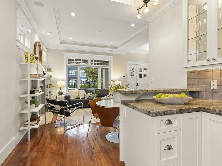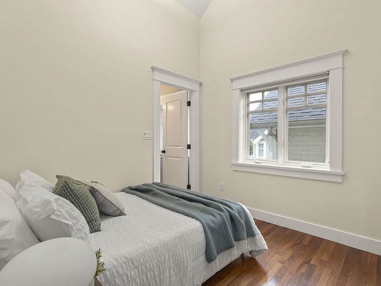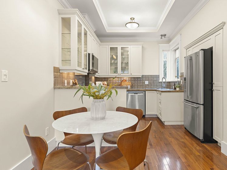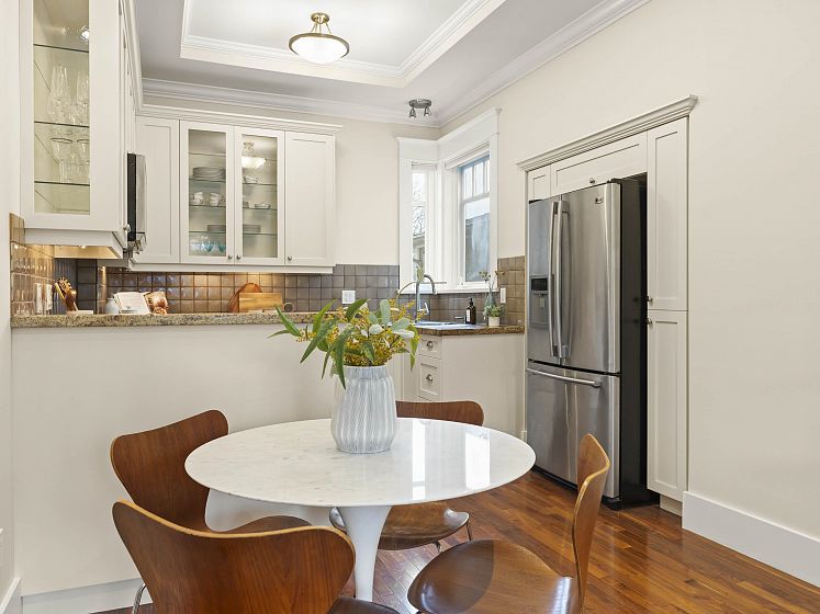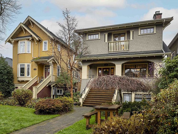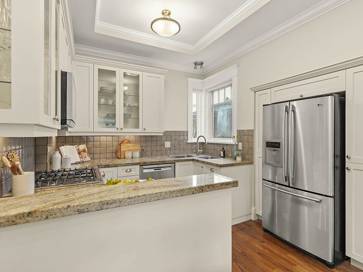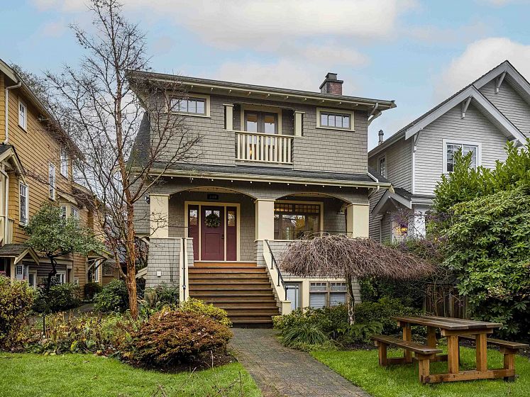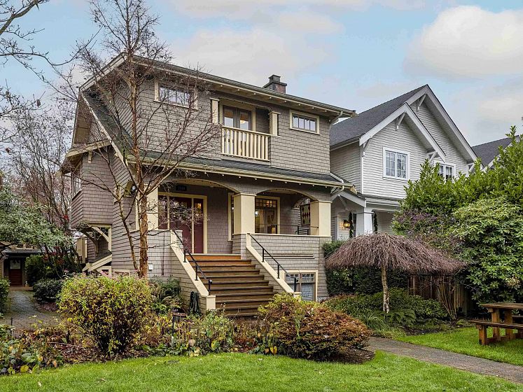 Beautiful Kitsilano craftsman-style 2-level home blending heritage charm with modern updates. Features 9'-12' vaulted ceilings, crown moulding, maple/cherry hardwood floors, vented skylights and a cozy gas fireplace. Updated kitchen with refinished cabinets, granite counters, Samsung gas stove and upgraded appliances. Two bedrooms each with full ensuites plus a handy workspace nook. Enjoy in-floor geothermal radiant heat, built-in speakers, fresh paint and upgraded lighting. Landscaped gardens, private parking pad and an unbeatable walkable location close to schools, parks, shops, transit and the beach. Minutes to UBC and downtown.