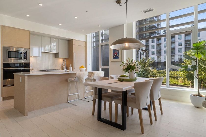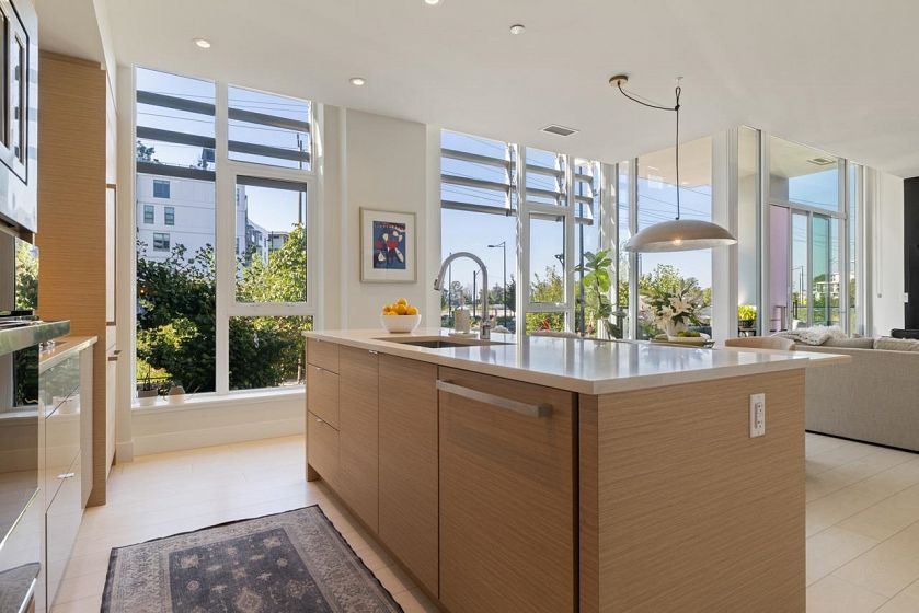 Best townhouse layout at MODE in the River District! Rare corner unit with 3 beds up, 3 baths, flex space, and 1,700+ sqft of smartly designed living. Bright and airy with oversized windows, two balconies, and great natural light. Upgrades include a custom wine bar w/ fridge and built-in coffee station. Gourmet kitchen features gas range, wall oven, integrated fridge/dishwasher, and quartz counters. South-facing with open layout, in-floor heating in primary ensuite, and high-efficiency heating/cooling system. Includes 2 parking and 1 storage. Enjoy resort-style amenities: hot tub, gym, concierge, theater, guest suites, dog wash, co-working hub & more. Steps to Save-On, Starbucks, restaurants, banks, wine shops, riverfront trails & more!