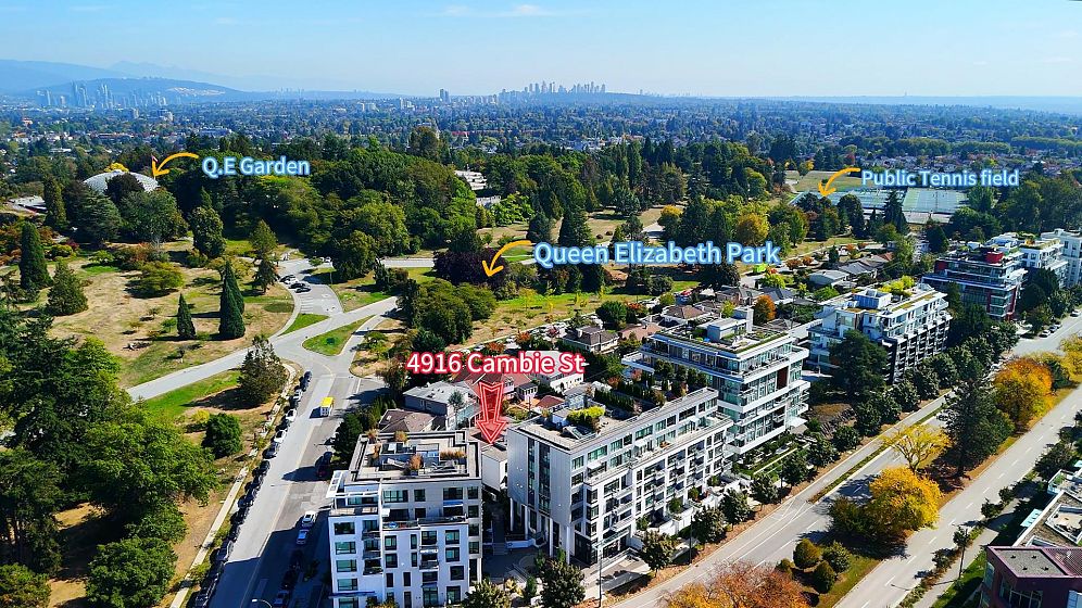 Welcome to this rarely available 2 bed / 3 bath CONCRETE townhouse, perfectly positioned in Vancouver's most central and park-side community. Tucked away on the quiet back row, this home offers the best of both convenience and tranquility - just across from Queen Elizabeth Park. Inside, soaring floor-to-ceiling windows invite natural light into every corner. Luxurious details include imported Italian cabinetry, stone countertops, premium "Miele" appliances, engineered hardwood throughout, and spa-inspired bathrooms. Stay comfortable year-round with built-in A/C. All this, steps to the Canada Line SkyTrain, Nat Bailey Stadium, Hillcrest Community Centre, Oakridge Mall, and within an excellent school catch. Don't miss this rare opportunity to live in this coveted home!