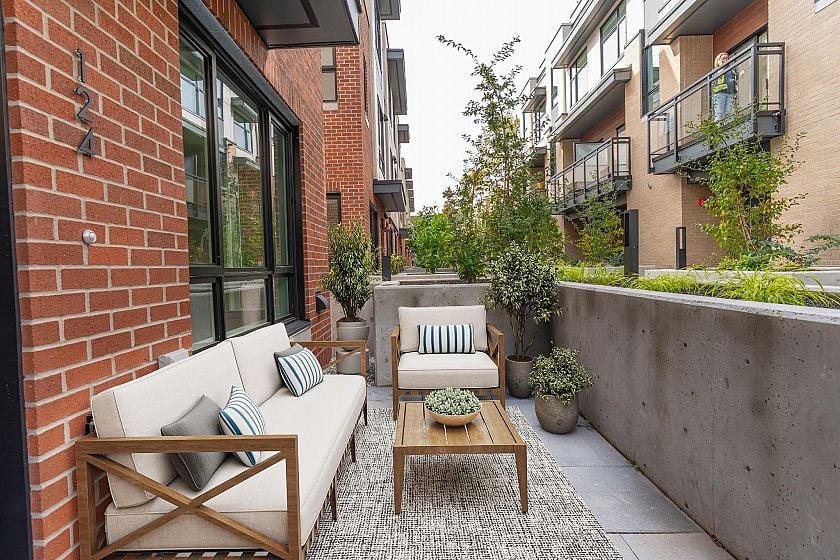 Plan B, an efficient jr. 2-bedroom home, offers 601 sq. ft. of thoughtfully designed interior space, complemented by a private outdoor terrace. The kitchen is equipped with a Bosch appliance package, polished quartz countertops, and sleek flat-panel cabinetry, blending functionality and minimalist aesthetics. This home features 9' ceilings, radiant in-floor heating, laminate flooring throughout and modern finishes. Located just steps from the Capilano River, trails, North Shore mountains and walking distance to Park Royal. This is your opportunity to embrace a balanced lifestyle surrounded by nature and community. Open house every Sat/Sun 12-4PM #116 2050 Glenaire Drive or by private apt call or e-mail. List price is net of 30K incentive