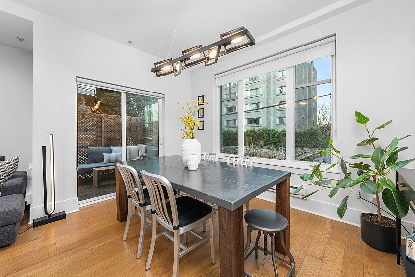 Welcome to Essence in the heart of Mount Pleasant. Meticulously maintained corner Townhome with 1,441 sq. ft. of modern living space. The open-concept main floor features engineered hardwood, a bright living room and a contemporary kitchen with quartz countertops and custom cabinets. Upstairs, enjoy your large primary bedroom with ample closet space and a beautifully remodelled en suite bathroom. Two separate outdoor spaces with one just off your living space that is perfect for entertaining and a top floor patio to enjoy the view. Fantastic location just steps to some of the best shopping and restaurants in the city.