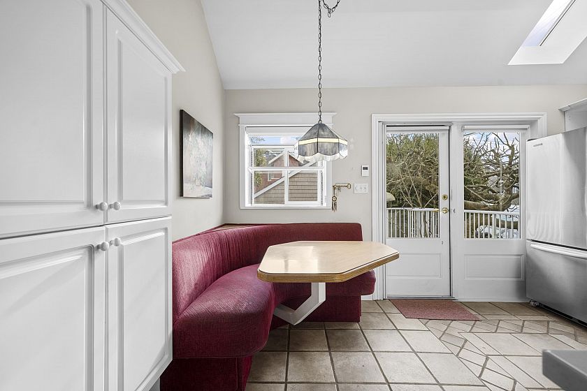 Welcome to this charming Kitsilano home w/ 3 bedrooms, 2 bathrooms, & over 1,600 sq ft of truly unique, one-of-a-kind living space. Nestled on a quiet, tree-lined street, this 1/3 share of a triplex blends classic character with modern comfort. The main level features a cozy living room w/ gas fireplace, a separate dining area, & a bright south-facing kitchen w/ heated floors, a built-in breakfast nook, & hot water on demand. The kitchen opens onto a sun-soaked deck with automatic retractable awning, ideal for morning coffee or evening entertaining. Bathrooms also feature heated floors. Prime location in Kitsilano, steps from local shops, cafes, parks, & all the city has to offer. BONUS detached DOUBLE car garage!