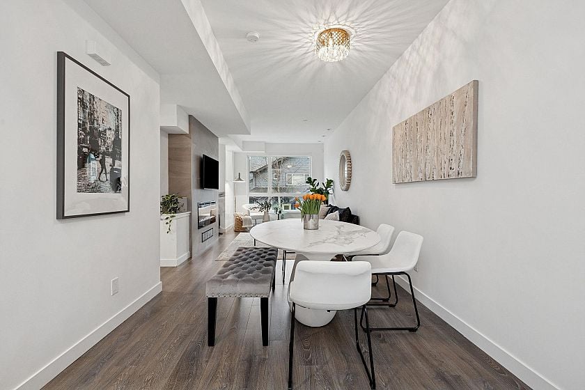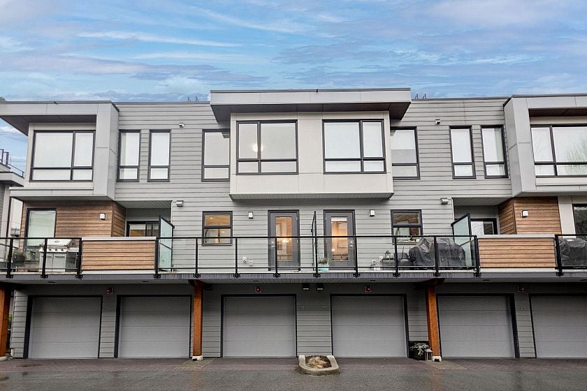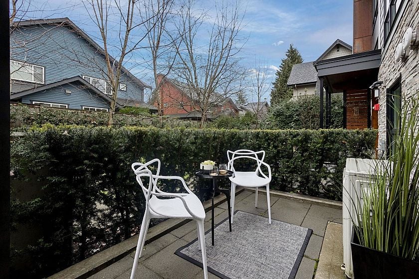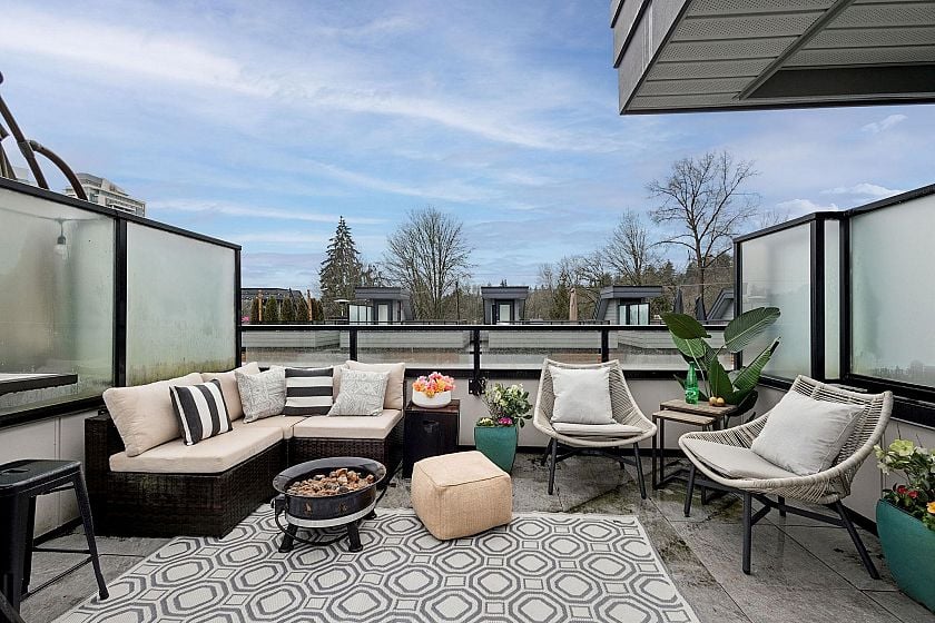This 2 bedroom, 2.5 bath home offers three outdoor spaces including a lower level patio, main level balcony, and a private rooftop patio oasis with hot tub, lounge area, and mountain views - perfect for entertaining or a retreat. Built in 2020 and lightly used, the home is in excellent condition. The open main level offers spacious living & dining areas w/ electric fireplace, powder room, plus a beautiful kitchen with a gas cooktop. Added comforts incl. A/C and hot water on demand. The primary bedroom offers soaring ceilings, an ensuite, and generous closet space. A garage with plenty of room for parking & storage. Plus an additional reserved parking space in front. Set in a peaceful setting with green space out front & easy access to highways, shops, groceries, trails, and recreation.
