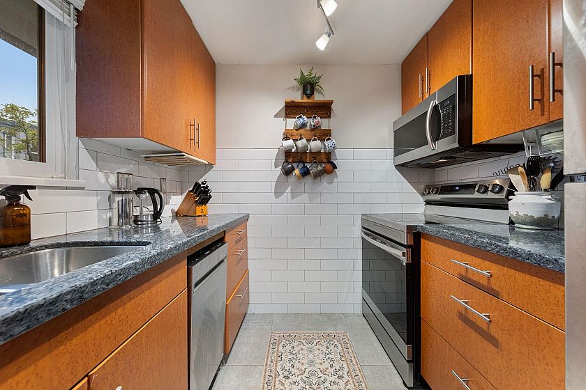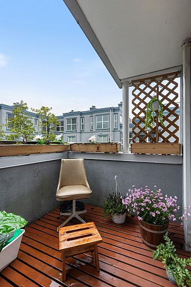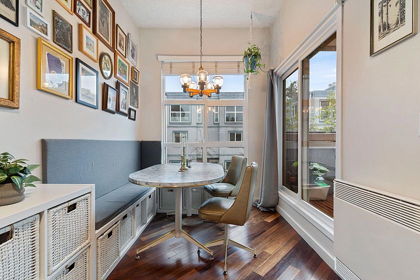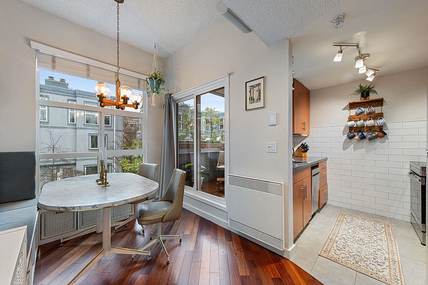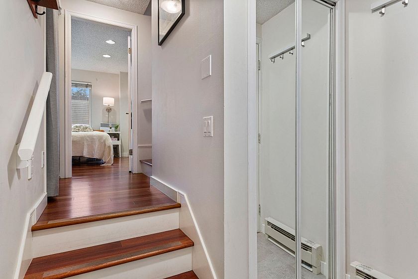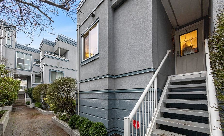 Gorgeous walkup townhome with 3 fabulous decks next to False Creek! Fully Rainscreened, this well-managed strata is quietly tucked away on one of the best blocks in Fairview. With light pouring in from windows on 3 sides, this tastefully updated End Unit features wood floors & unique split layout. Finally a large living room with fireplace & skylight hatch to a sunny, private roof deck! The charming dining room has a handy BBQ deck too! Primary room has built-ins + ensuite. Murphy bed in the guestroom/office & laundry incl. Superb strata guest suite for $60/night! This idyllic location allows direct access via footbridge to the beloved waterfront with seawall, dog park & playgrounds. Easy stroll to VGH, Skytrain, Cambie shopping district, the Broadway boom & Granville Island/Market! WOW!
