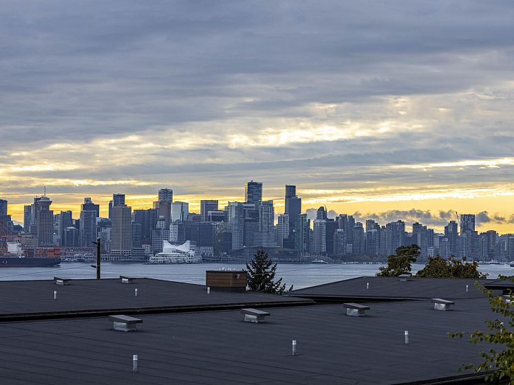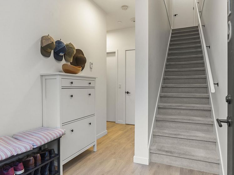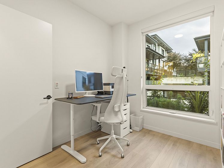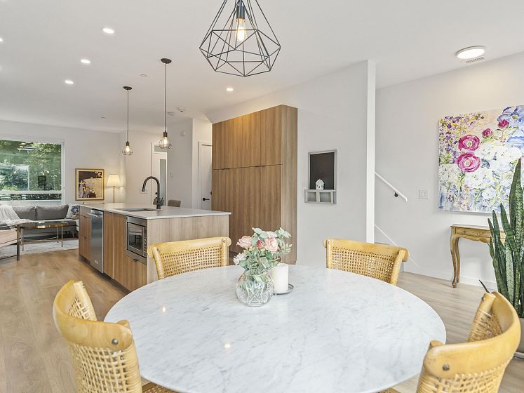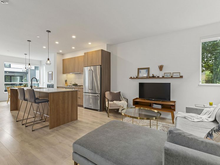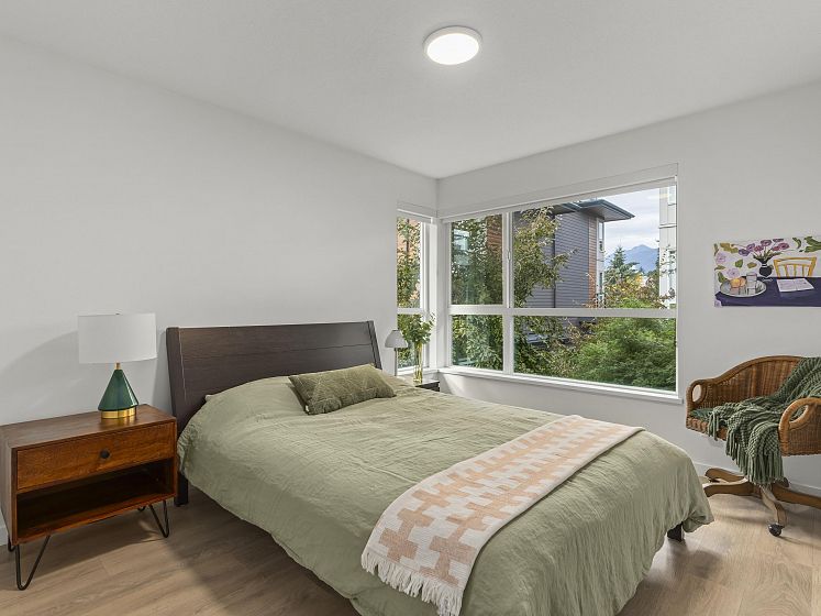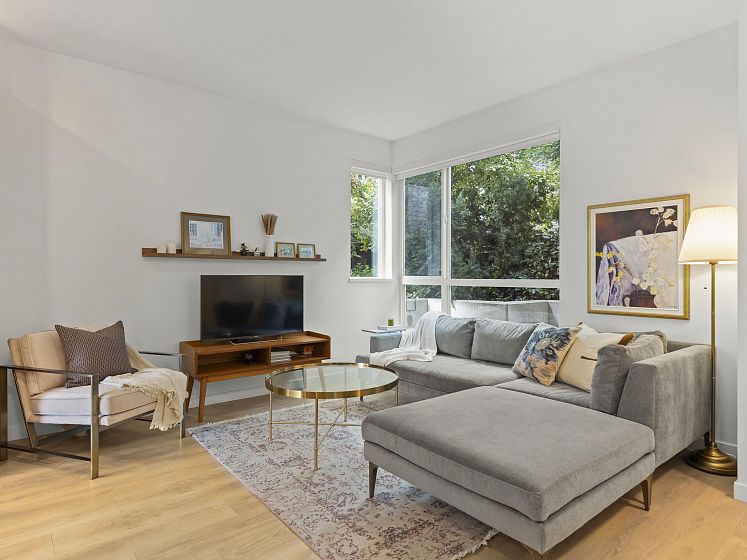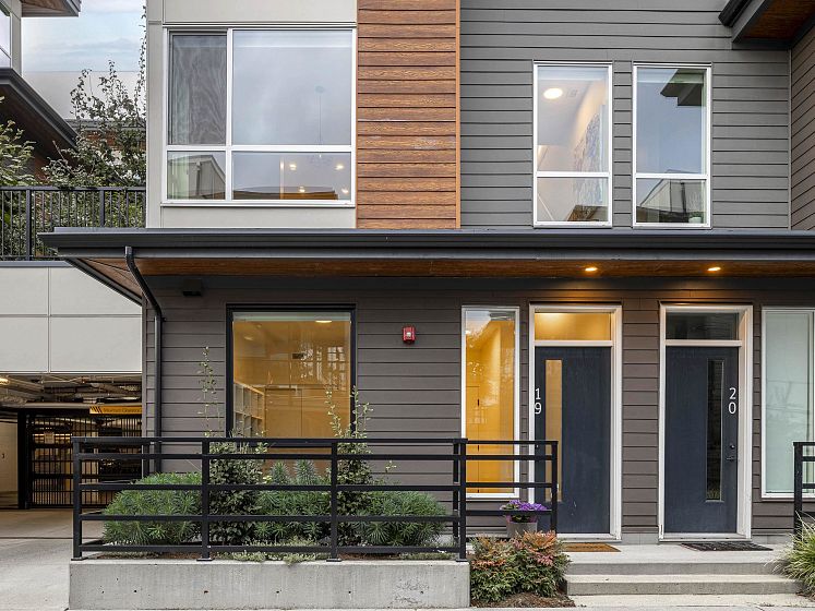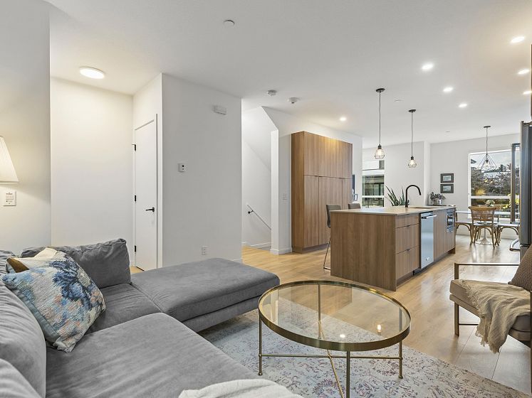 Introducing this thoughtfully appointed, corner townhouse on the quiet side of Founders Block, a LEED Gold–certified community by Anthem. Beautifully positioned w/ an entrance on the charming laneway, away from 3rd St. This scandi-inspired home is drenched in light from N, S & W facing windows. Engineered hardwood, in-floor heat, HRV, sleek kitchen w/gas range and stone countertops make this open-concept home sing. Share gorgeous city & water views from the top floor with friends or enjoy your patio in the lush courtyard while barbequing dinner. Direct access to 2 parking (1 EV) and 2 oversized storage lockers provides endless convenience. Steps to Moodyville Park, a short stroll via the Spirit Trail to Lonsdale, The Quay, and the SeaBus—urban convenience in a peaceful, connected setting.