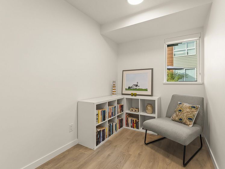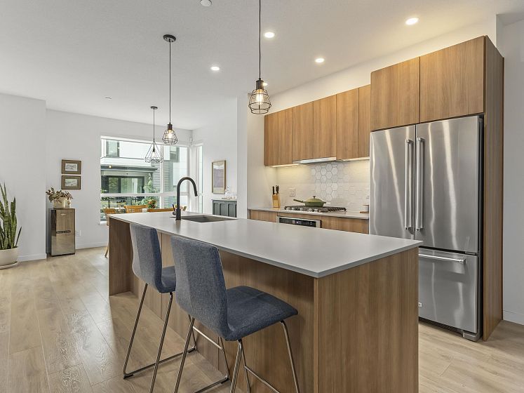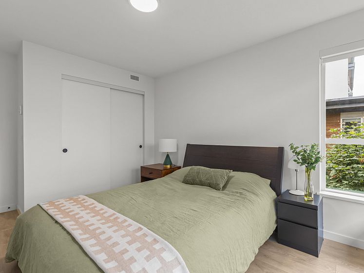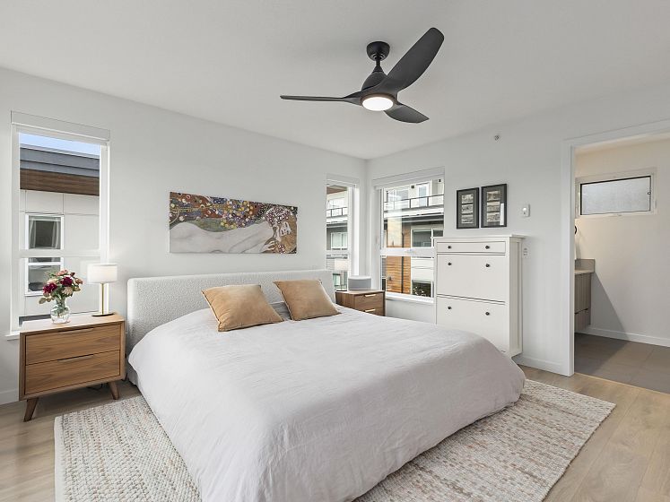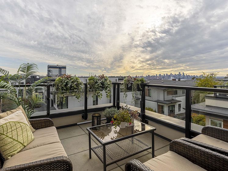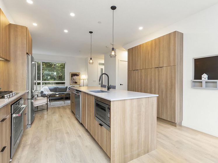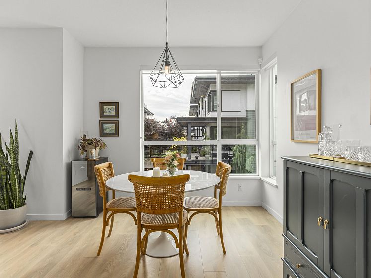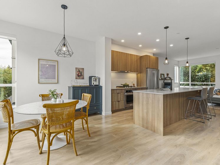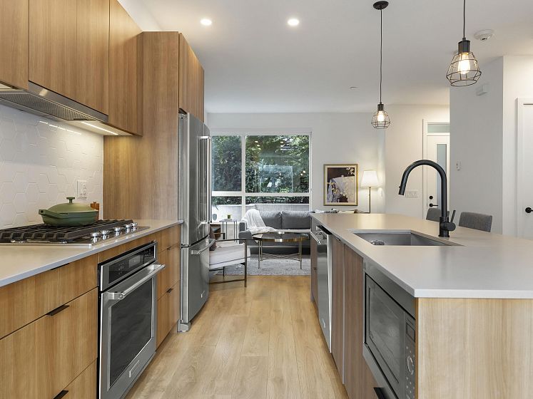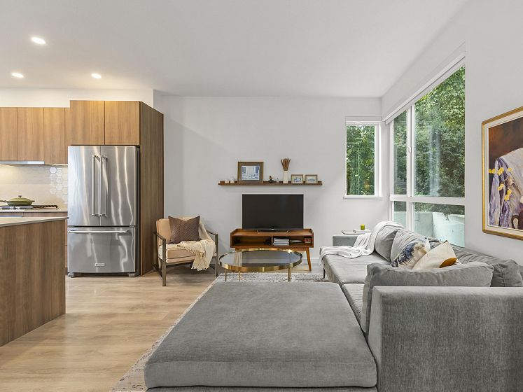Introducing this thoughtfully appointed, corner townhouse on the quiet side of Founders Block, a LEED Gold–certified community by Anthem. Beautifully positioned w/ an entrance on the charming laneway, away from 3rd St. This scandi-inspired home is drenched in light from N, S & W facing windows. Engineered hardwood, in-floor heat, HRV, sleek kitchen w/gas range and stone countertops make this open-concept home sing. Share gorgeous city & water views from the top floor with friends or enjoy your patio in the lush courtyard while barbequing dinner. Direct access to 2 parking (1 EV) and 2 oversized storage lockers provides endless convenience. Steps to Moodyville Park, a short stroll via the Spirit Trail to Lonsdale, The Quay, and the SeaBus—urban convenience in a peaceful, connected setting.