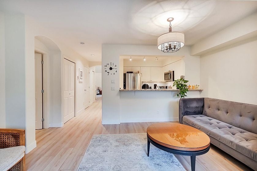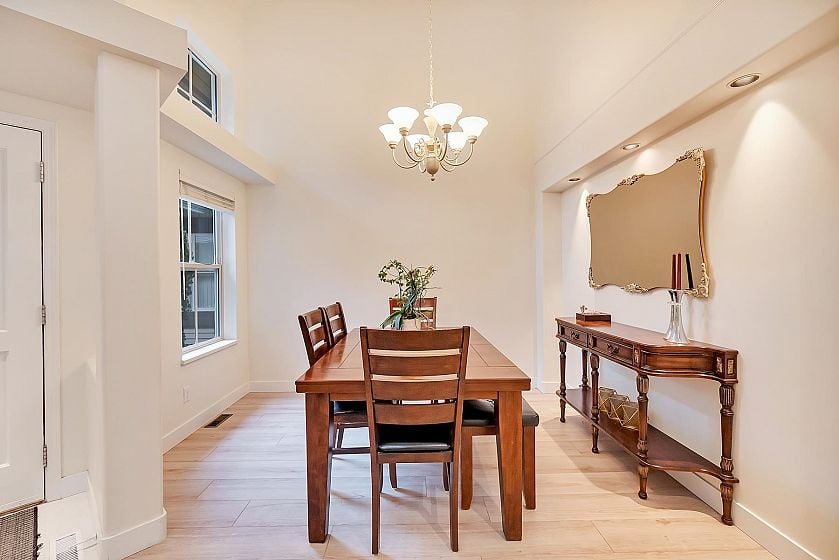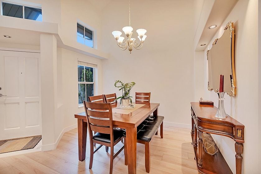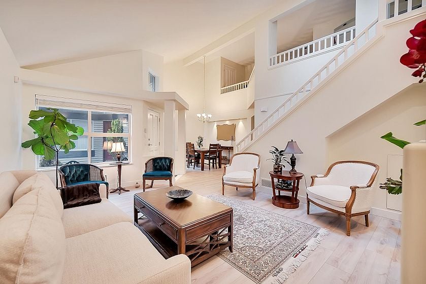 This townhome feels like a HOUSE! Welcome to Nahanee Woods, a beautifully maintained gated townhome community in Northlands. This spacious 2-level home features updated floors, vaulted ceilings, skylights, and a cozy gas fireplace. The main floor offers a high ceiling living/dining area and an open-concept kitchen and family room leading directly to a private southwest-facing patio, offering a quiet spot to relax outdoors, and a primary bedroom with a full ensuite. Upstairs you'll find 2 additional bedrooms, a full bath and a spacious LOFT area that's perfect for a home office. Includes an attached double garage. .Close to parks, trails, and amenities! Upgrades: New flooring, Carpet, window blinds & Full interior painting.
