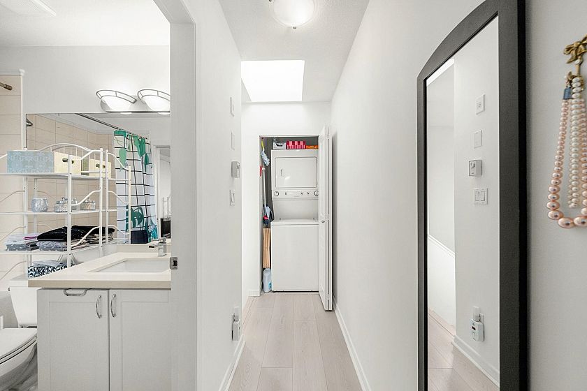 Rare & highly desirable top floor townhome in Point Grey at 10th & Alma. This 1 bed, two level home offers the privacy of a townhouse with the convenience of city living. Enter through a secured courtyard to your own quiet, south-facing garden patio, an open-concept kitchen/dining/living area with bar counter, gas fireplace, skylight, in-suite laundry & a skylight for natural light. Upstairs, the bedroom is a true sanctuary, complete with a private balcony & unobstructed mountain views. Proactive strata & a fully rainscreened building. Location is unbeatable, offering effortless transit, quick access to UBC, top-ranked schools, shops, cafés & restaurants along West 4th & Broadway. Downtown Vancouver is just a short commute away. Pet-friendly building. Storage locker&secure parking included