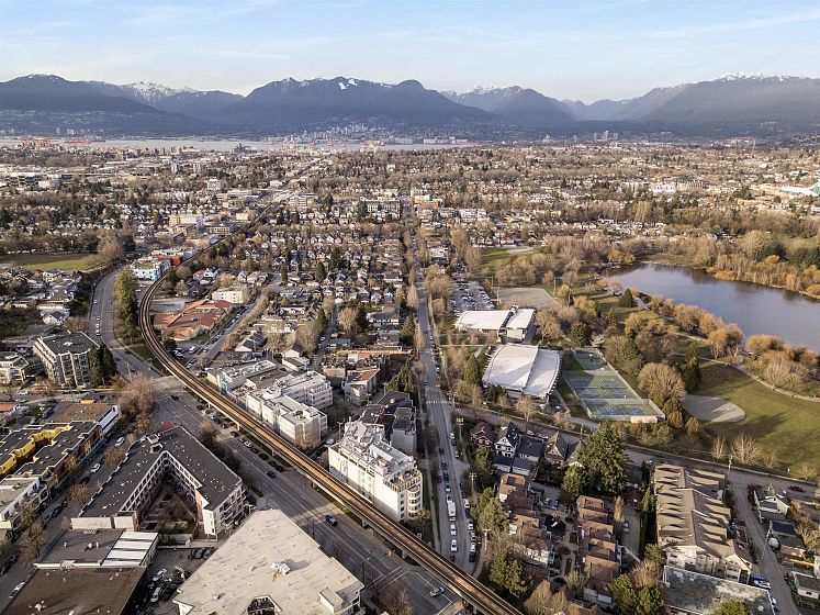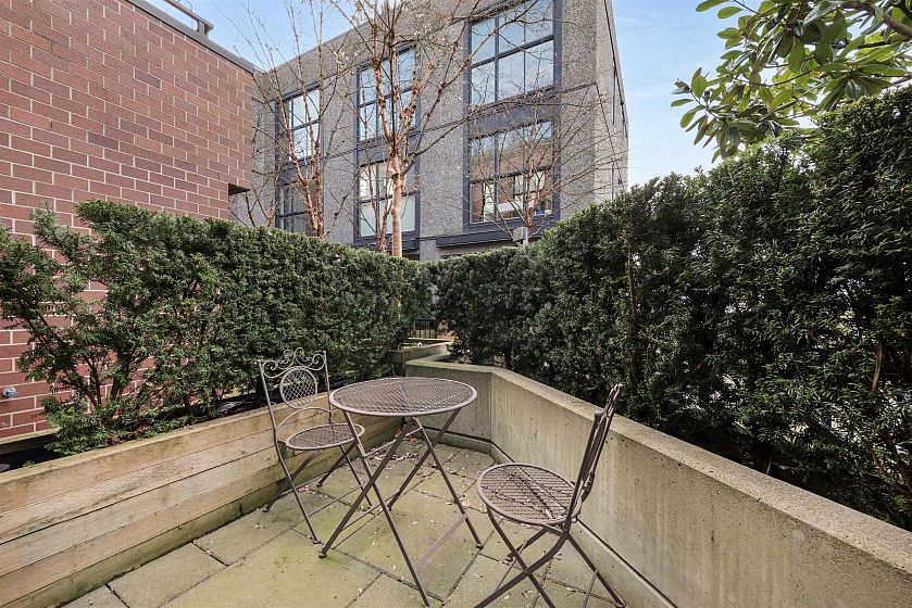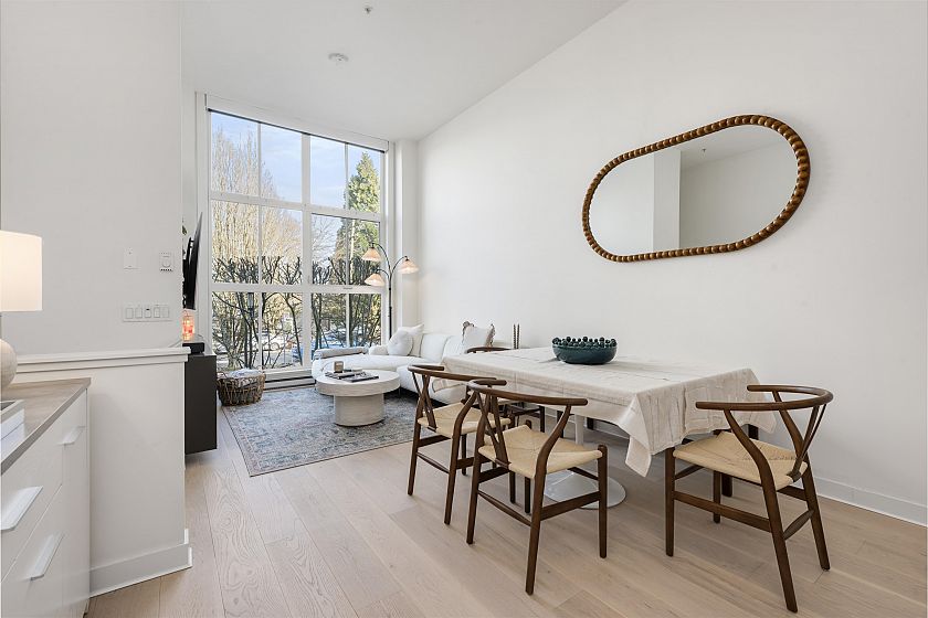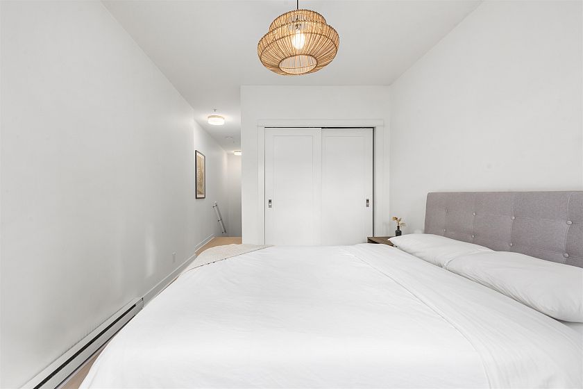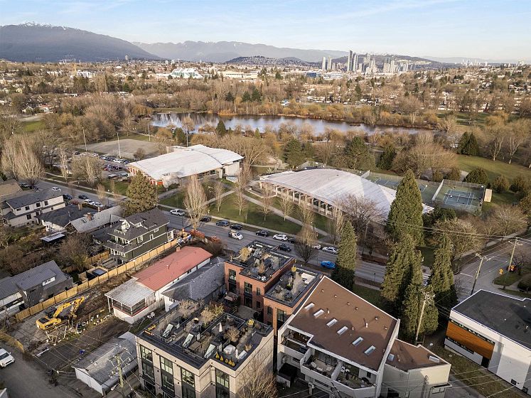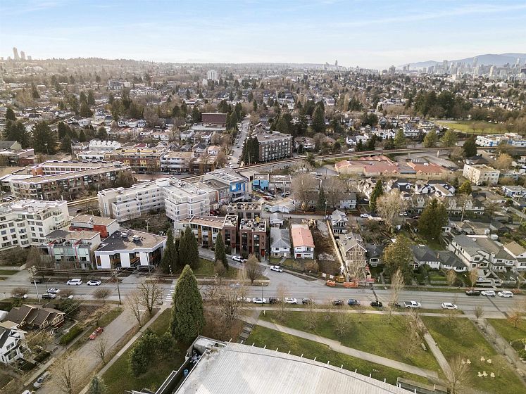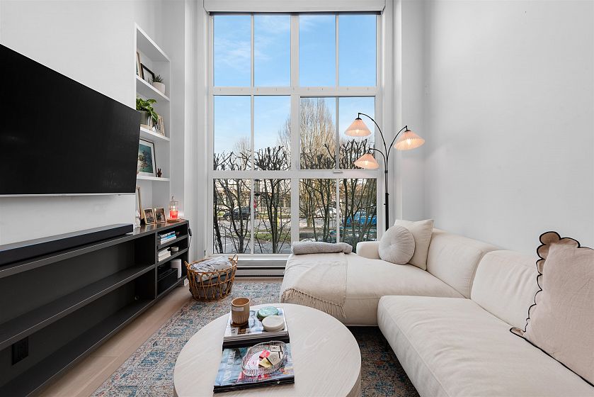 Welcome to Mason by Boffo, a boutique collection of modern townhomes located across from Trout Lake Park. This bright, stylish home features private street entry, soaring 12-foot ceilings, oversized windows, and open-concept living. The sleek kitchen includes quartz counters, marble tile backsplash, matte lacquer cabinets, and premium appliances. Enjoy a sun-soaked west-facing patio off the primary suite and a second bedroom with space for a home office. Updates include new hardwood floors throughout, custom built-in closets, and a new hot water tank. Includes one secure parking stall, storage locker, and bike storage. Steps to Trout Lake, trails, Commercial Drive, and SkyTrain. A must-see!