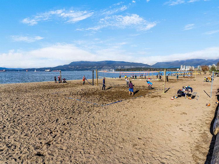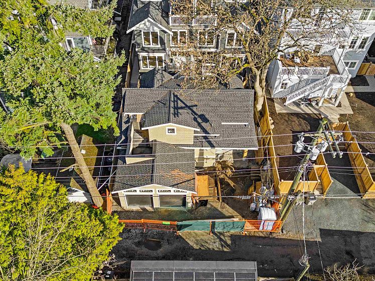 NEW! DETACHED SUNNY COACH HOUSE IN A PRIME LOCATION NORTH OF 4TH. This 1216 s.f. 2 bed, 2.5 bath, south facing home comes with 1 car attached garage together with roughed-in EV and solar wiring ports. Bright kitchen with Fisher & Paykel appliances, wide Ash wood floors throughout with radiant in floor heating & Terrazzo bathroom tiles. French Doors off the living room lead out to a south facing balcony and garden. 2 bedroom, 2 baths upstairs. Master with vaulted ceilings and a quiet south facing deck, overlooking trees and homes. A/C, hot water on demand etc. You will love living here! This stand alone unit is tucked away in a neighbourhood of large blended character homes. Walk to Kits Beach, tennis courts & pool, Private Clubs plus trendy 4th Ave shops. Open Sunday 2-4pm.