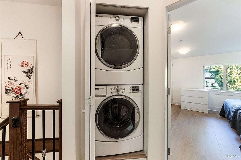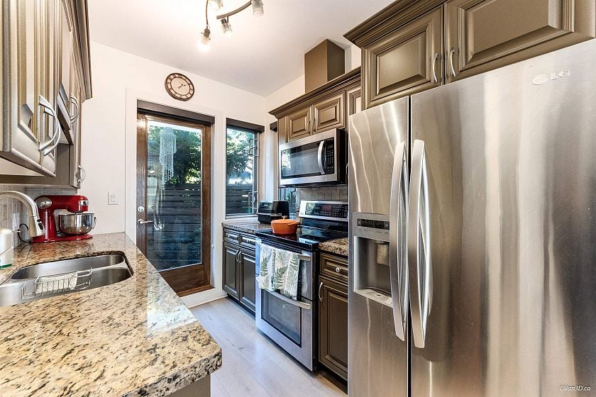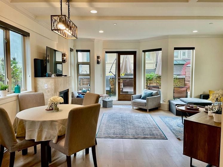 Walking distance to Shipyard , While many townhouses feel more like condos, this home truly lives like a house—with your own private street-level entry. Sun-drenched wraparound south-facing terrace with natural light throughout. 3 bedrooms and 3 bathrooms, all bedrooms are located on the same level, each with large closets. The primary suite includes a private ensuite bath. Downstairs, enjoy a spacious recreation room complete with a built-in queen-size Murphy bed – perfect for guests or to be considered as a fourth bedroom. Upgraded German waterproof laminate flooring throughout, Miele dishwasher and LG fridge. 2 underground parking stalls . 1 Storage - Well maintained complex and a healthy contingency fund , low strata fee- High Ceiling 9'4 bright, open, and airy feel. By appointment