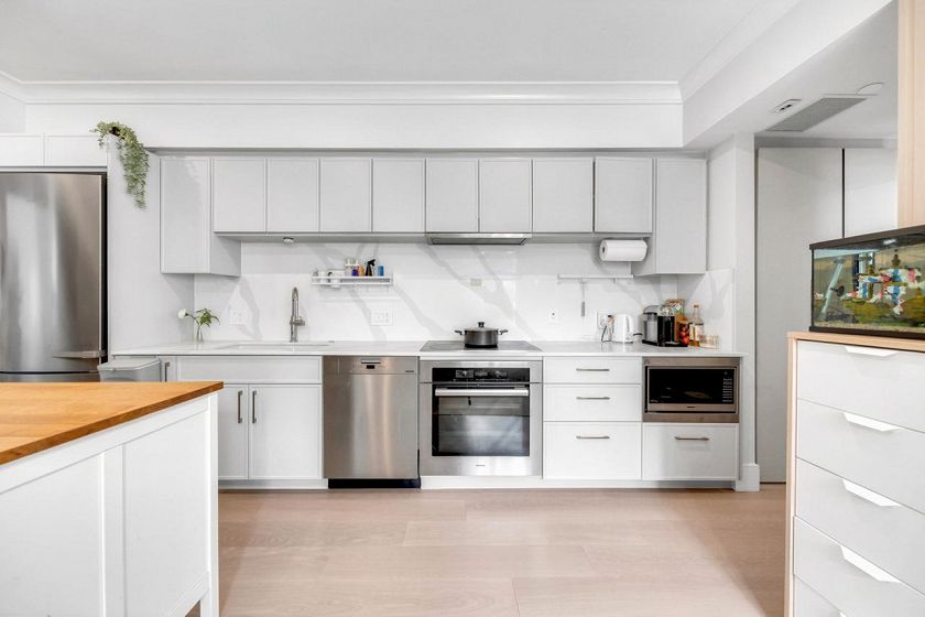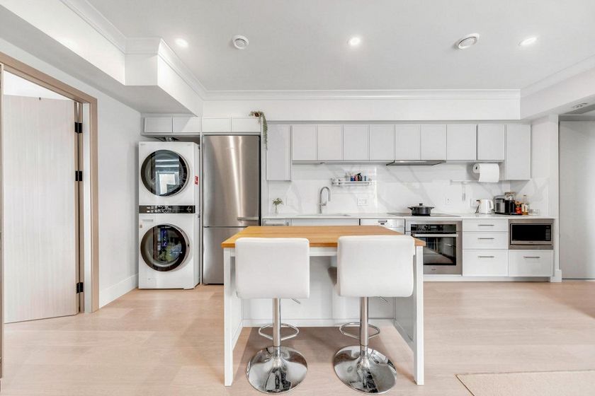 Lusa Village presents a well-crafted townhome in the sought-after South Granville neighbourhood. This 2-bedroom, 1-bath residence features a contemporary interior with quality finishes throughout. Bright open living and dining areas are complemented by large windows that bring in abundant natural light. The kitchen is equipped with premium Miele appliances and custom millwork, combining functionality with refined style. Both bedrooms are well-sized and versatile for comfortable living or a home office. Thoughtful design and solid craftsmanship are evident throughout. Includes 1 EV parking stall, 1 storage locker, and 1 bike locker. School catchment:Dr. R. E. McKechnie Elementary & Magee Secondary. Open house: Apr.12 Sun 2-4 pm
