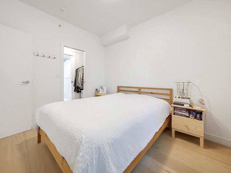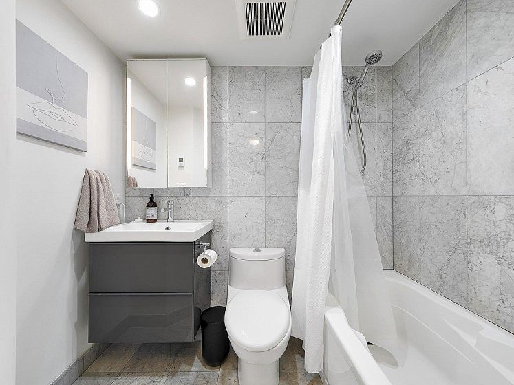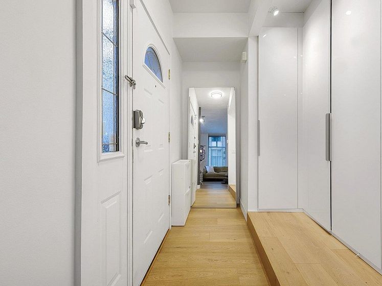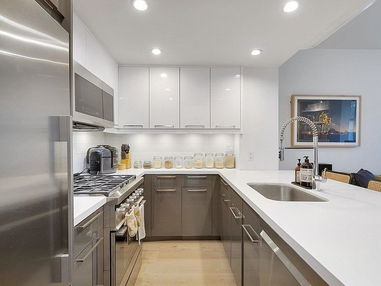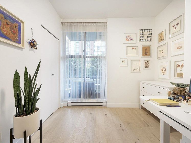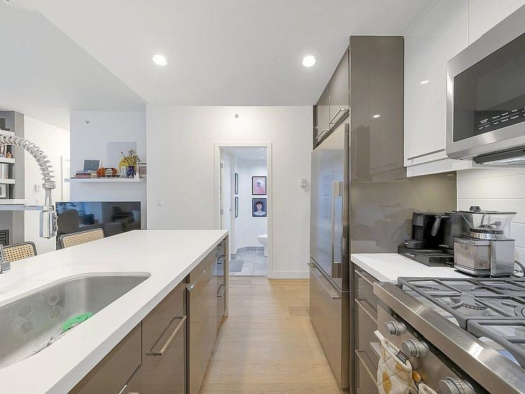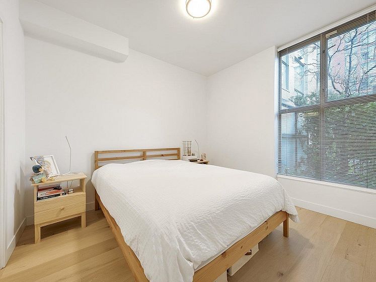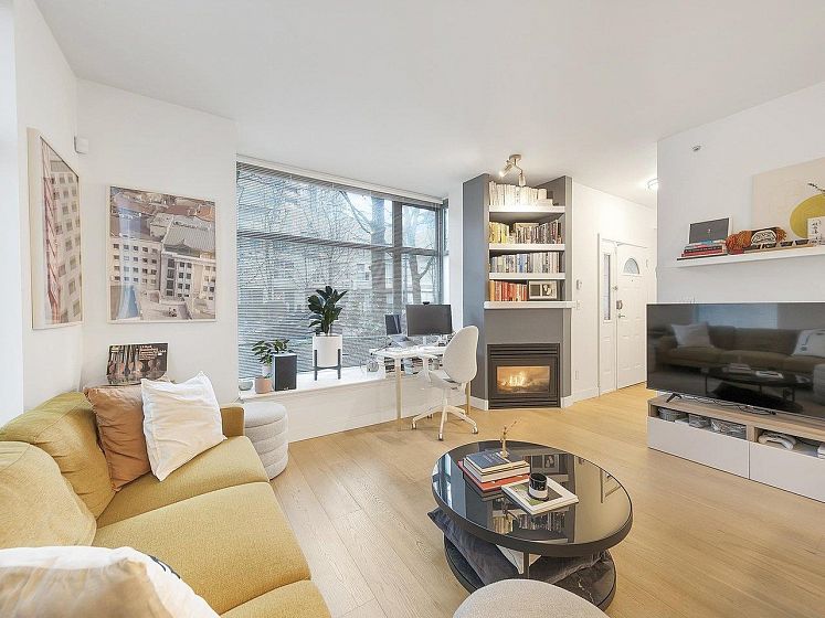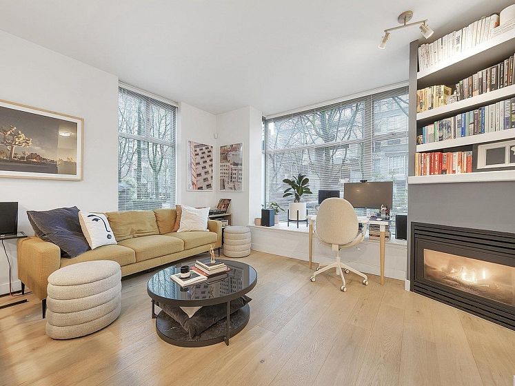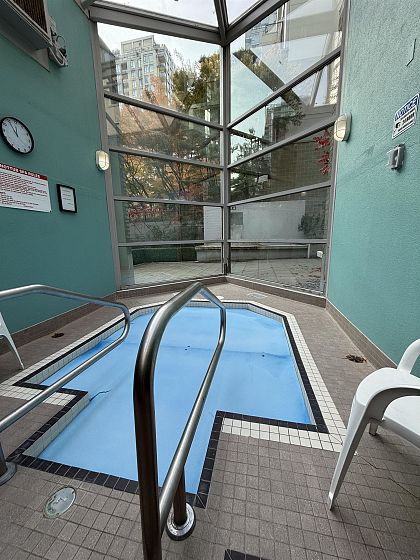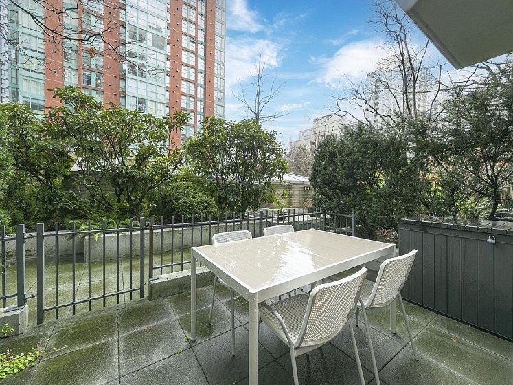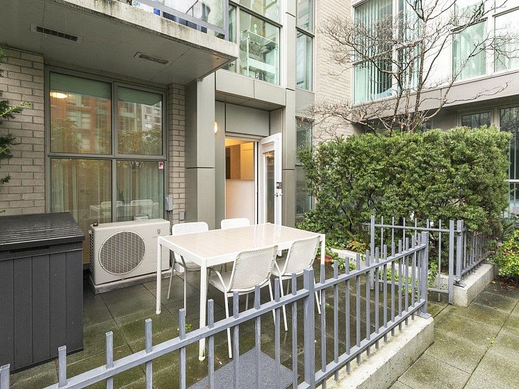 This beautifully renovated 1 level, 2 bed/2 ba corner-unit townhome, flooded with an abundance of natural light, at the well-appointed Savoy awaits you. Enter from the street (walk-up townhouse) or from private back entrance & large private courtyard patio within the building to this air-conditioned unit with open concept kitchen, breakfast bar, stainless steel high end appliances & high ceilings. Amenities incl indoor pool w/skylights allowing for natural light & patio, well appointed gym, hot tub, saunas, games room guest suite and more. 1 parking & 1 full sized storage locker. Walking distance to everything. Strata plan shows 735sq ft, professionally measured @ 746 sq ft, buyer to confirm to their satisfaction. Call your agent today to view this gorgeous home.