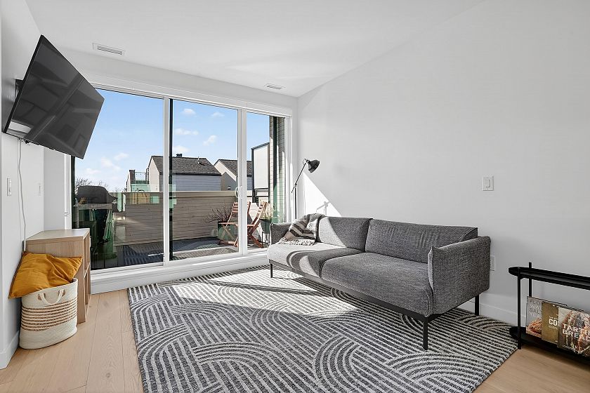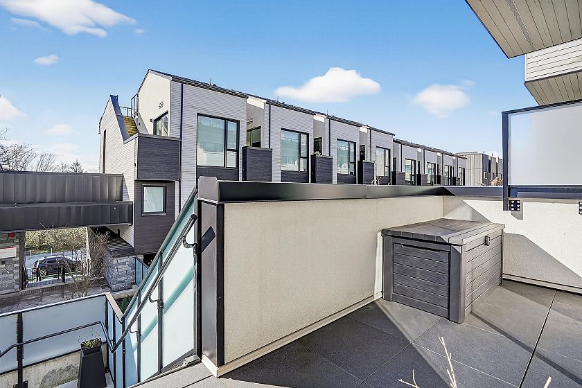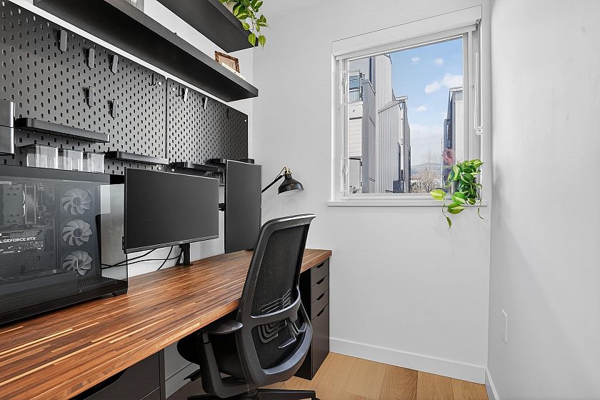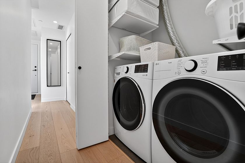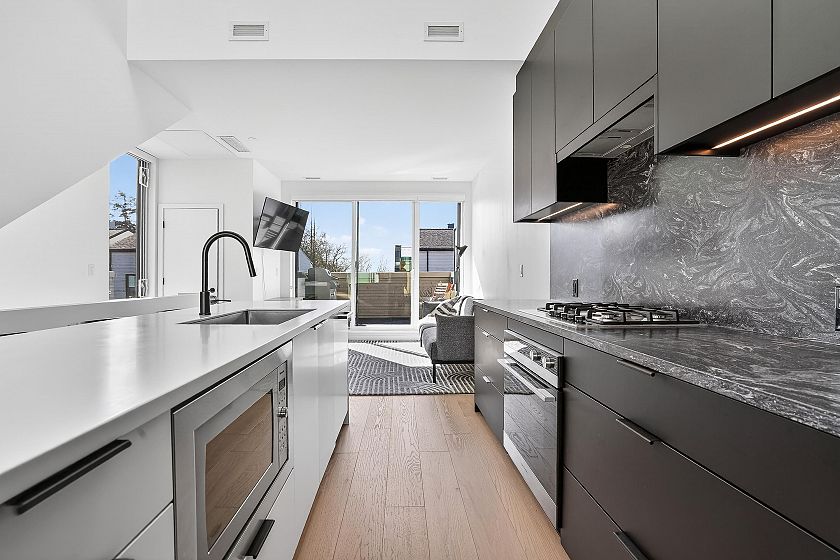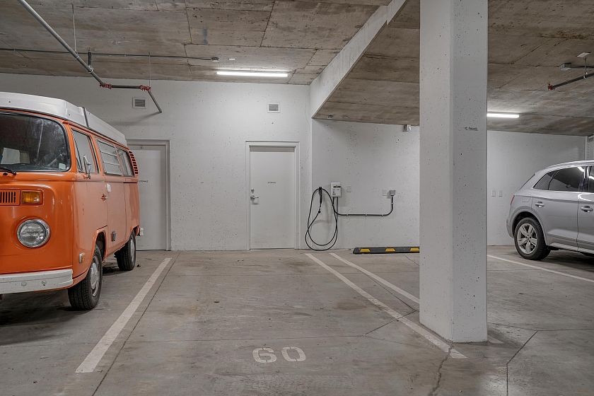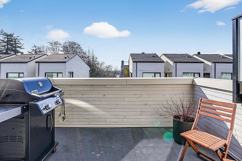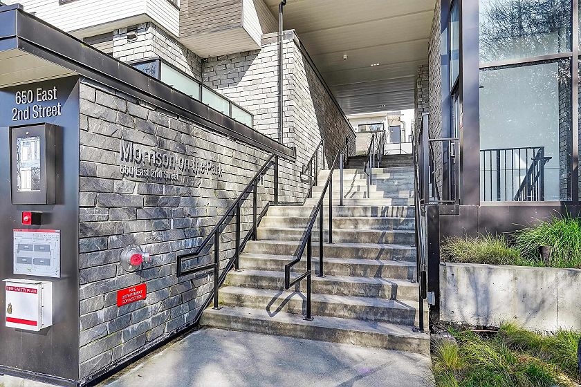 2 bedroom and den corner unit in the black colour scheme. This home has great upgrades including hardwood flooring on the stairs ($4K upgrade), an EV charging station, air conditioning, and a 150sf storage locker ($30K upgrade). Home has a wonderful layout with a useable den that functions like an office and large roof deck with a great view of city and the ocean. Backed by the balance of a 2-5-10 warranty and a reputable north Vancouver Developer (CREO) this home is move in ready for summer on the roof deck. 1 secured parking included.