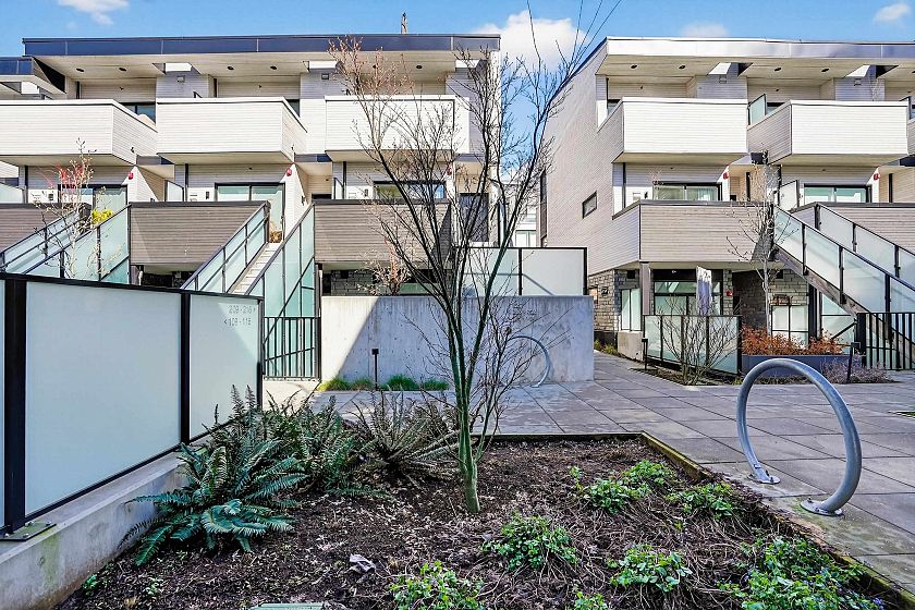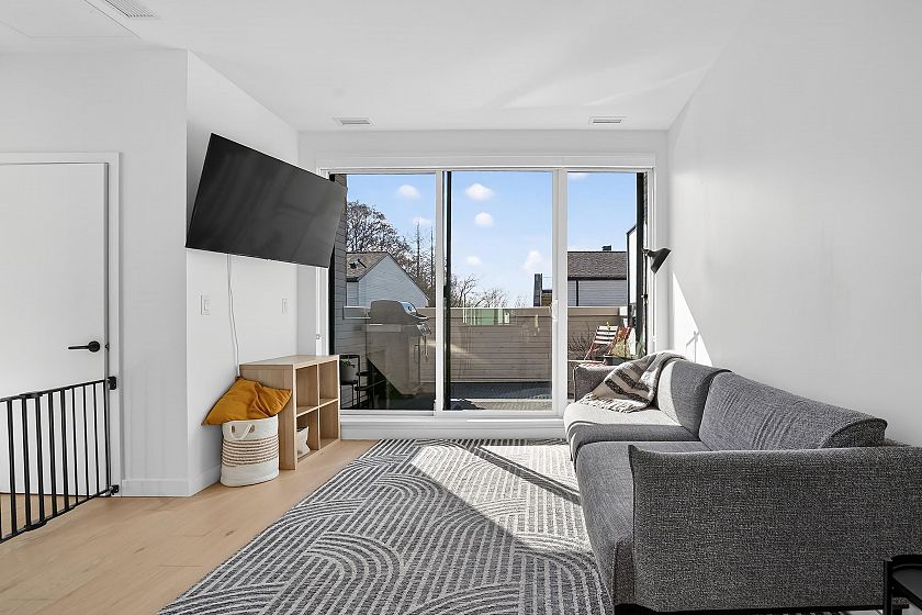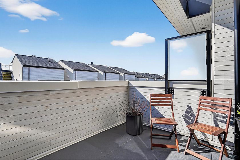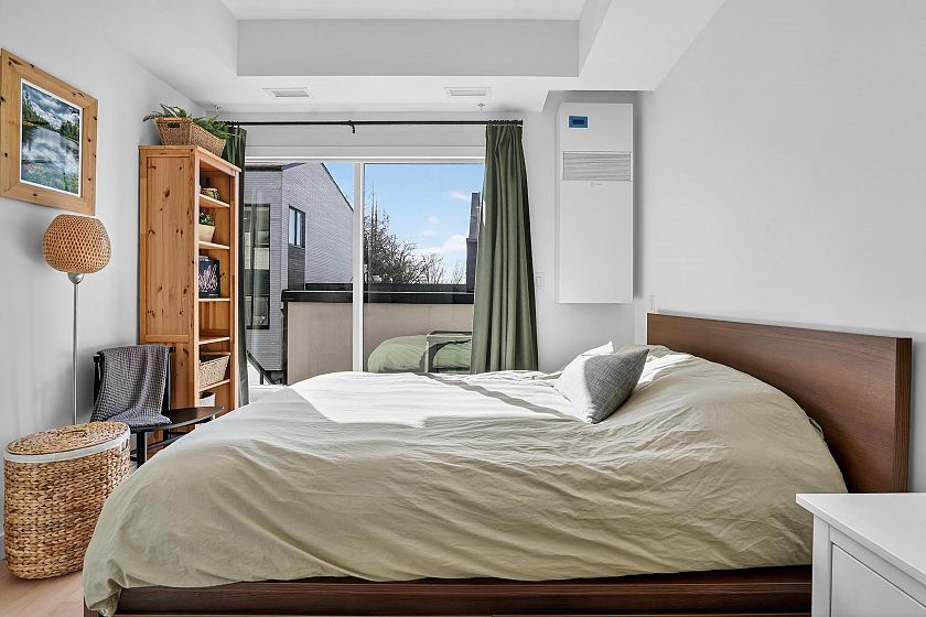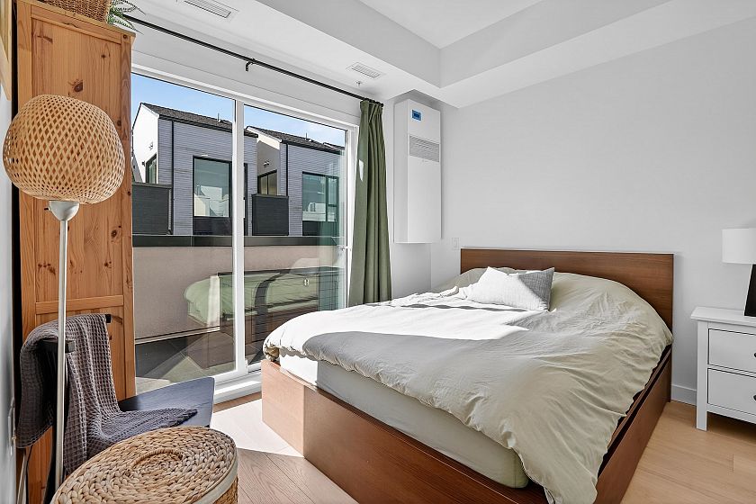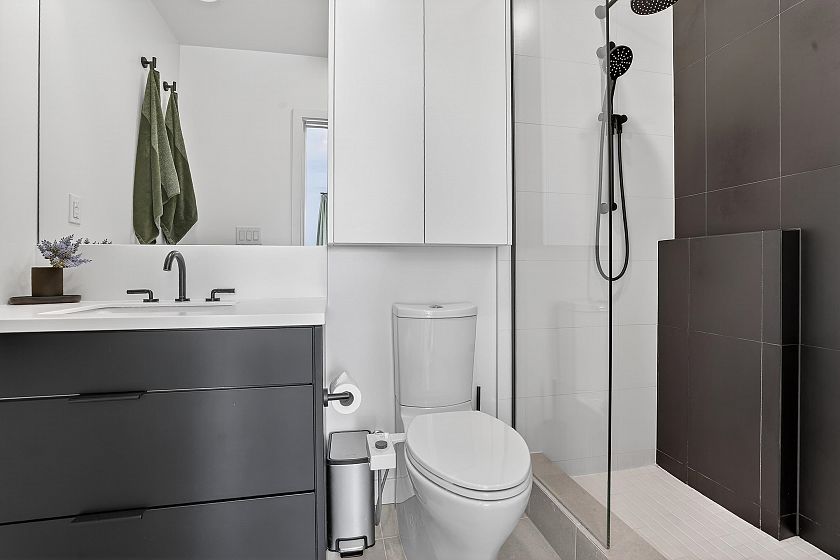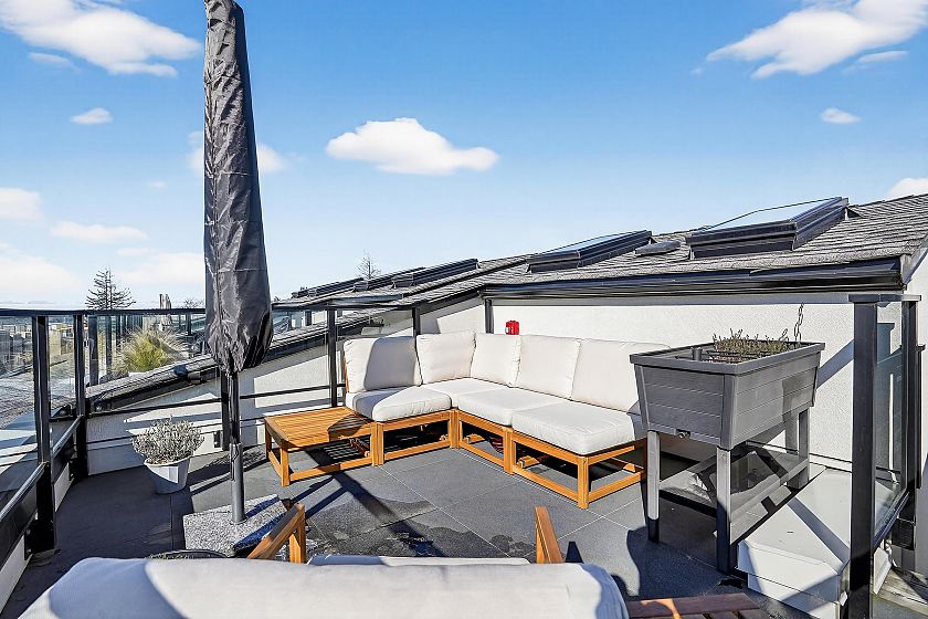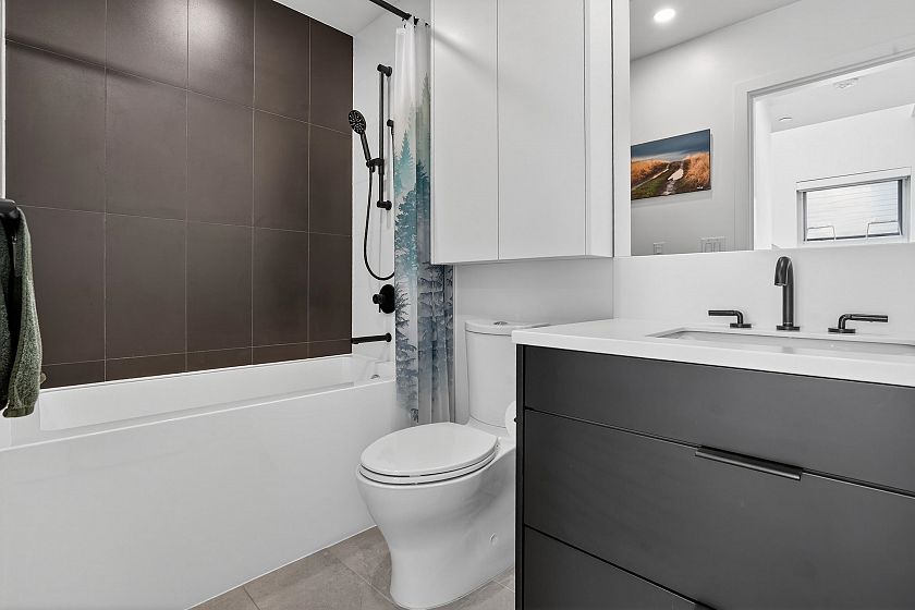 2 bedroom and den corner unit in the black colour scheme. This home has great upgrades including hardwood flooring on the stairs ($4K upgrade), an EV charging station, air conditioning, and a 150sf storage locker ($30K upgrade). Home has a wonderful layout with a useable den that functions like an office and large roof deck with a great view of city and the ocean. Backed by the balance of a 2-5-10 warranty and a reputable north Vancouver Developer (CREO) this home is move in ready for summer on the roof deck. 1 secured parking included.