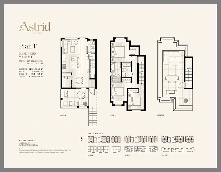 Own at ASTRID in the heart of Cambie Village west of Cambie St near DOUGLAS PARK. This 3 bedroom + den + 2.5 bath home faces West 24th Ave onto a residential treed street. Enjoy ROOFTOP VIEWS of the North shore mountains and treetops. Above average width homes dual A/C & heating system, integrated BOSCH appliances, silestone countertops & backsplash, engineered hardwood flooring throughout. 1 parking + 1 storage locker incl. Walking distance to the latest hot spots, Elio Volpe, June, Paragon Tea room, shop at Cadine and Walrus, meet your friends for coffee at JJ Bean at Park Theatre. Exceptional schools and King Edward skytrain to catch a concert or sporting event downtown. Est. completion summer 2026. This unit is Plan F under construction. MLS Photos AND Virtual Tour Plan H.