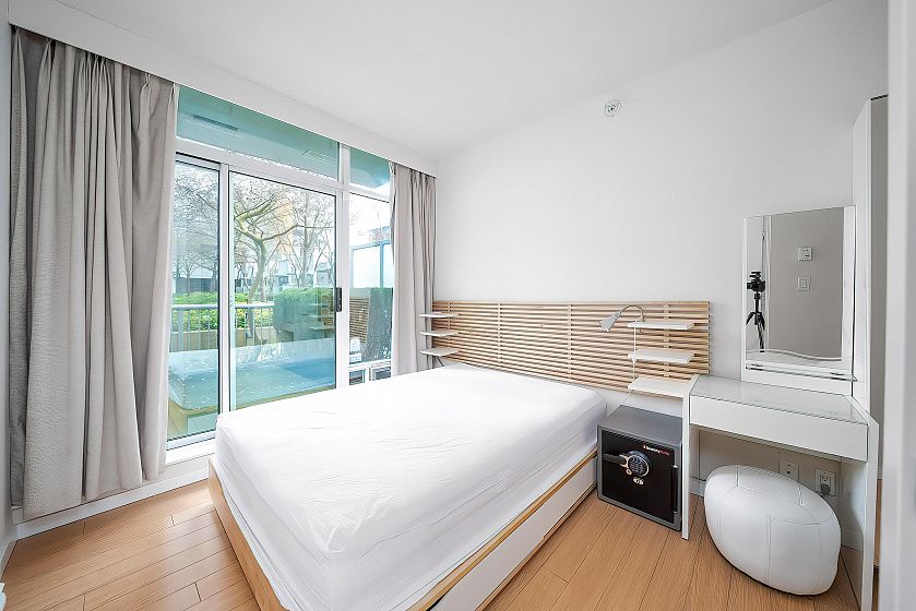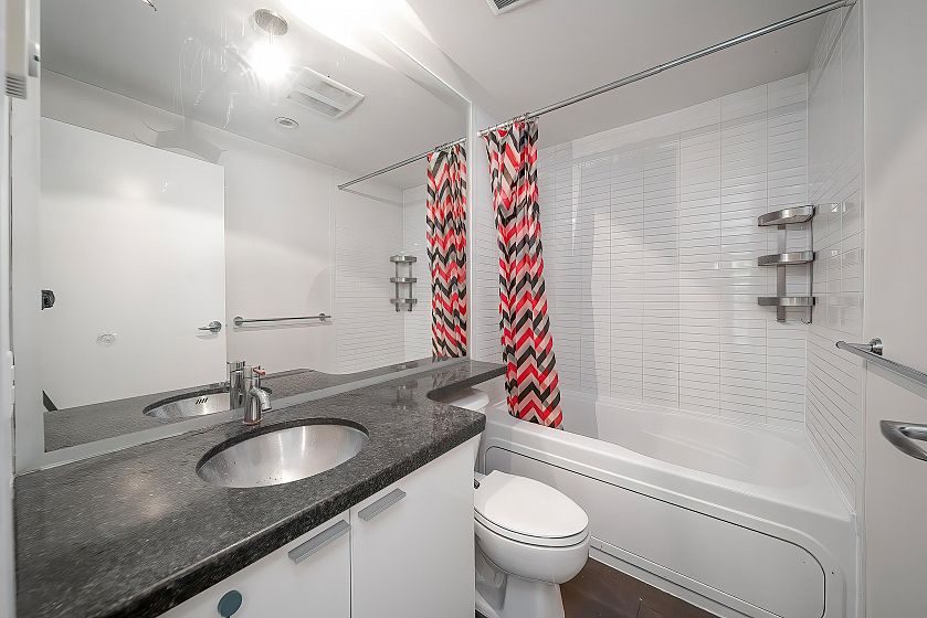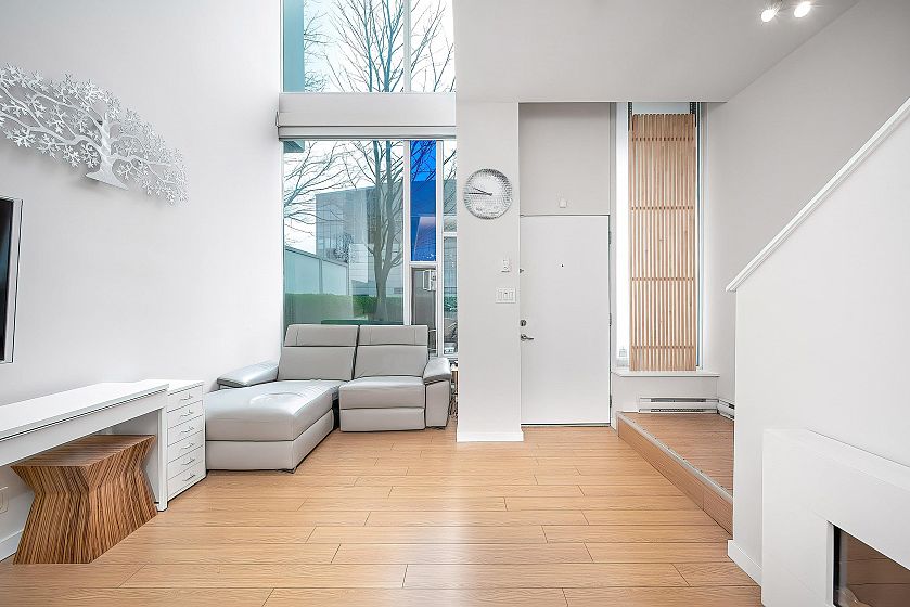 Fabulous 856 sqft Townhome in Spectrum 3. Private rooftop deck with 3 other patios! The first patio is off the living area, another off the master bedroom and one is next to the Loft which can be used as a second bedroom, den or an airy home office. This Townhome is city zoned for Live/Work which makes them extremely appealing to home business people. Freshly updated with new paint. The windows are expansive and the living room has 20 foot ceilings-the perfect space for entertaining. The complex has 24 hour concierge service & boasts a fabulous recreation centre with a spectacular swimming pool, steam, sauna & whirlpool. Walk to Skytrain, Costco, GM Place, BC Place, Downtown Business Centre, False Creek, Library, Downtown Campuses.Open House Apr 11 &12 (Sat &Sun) 2-4pm.