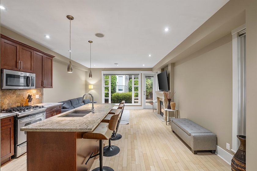 Non-conforming strata triplex with no strata fees! Built in 2007, this charming Craftsman-style townhome in Central Lonsdale offers 1,552sqft across three spacious levels. The main floor features 9' ceilings, a gourmet kitchen with granite counters, breakfast bar, stainless steel appliances, and a gas stove, flowing into an open dining and living area with a cozy gas fireplace. A powder room and private patio with secure backyard, plus a single-car garage off a quiet lane. Upstairs, vaulted ceilings highlight the primary suite and a spacious second bedroom. The lower level offers flexible space for a family room or third bedroom with walk-in closet, with plumbing roughed-in for an additional bathroom. Central location, steps to Lonsdale shopping, recreation and amenities.
