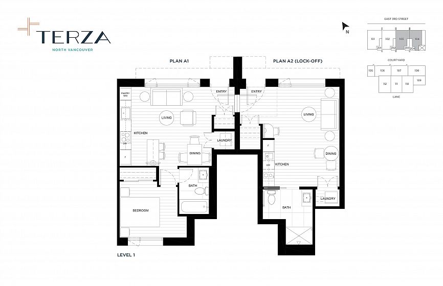 Welcome to Unit A1/A2 at TERZA by NAM Developments. This exceptional live/work unit features a 1 BR layout with a lock-off that can be rented out separately or used as an office or workspace. Located in North Vancouver's Lower Lonsdale neighborhood, TERZA is a boutique collection of urban townhomes within walking distance of parks, schools, recreation, and urban conveniences. Designed to the highest B.C. Building Code Step 4, TERZA homes are net-zero-ready, offering up to 50% energy efficiency and sustainability compared to traditional homes. Luxurious features include air conditioning, heated bathroom floors, rooftop decks, Quartz countertops, Kohler fixtures, sleek roller blinds, and a Fisher Paykel appliance package. Designed by Helen Basharat of BFA Studio Architects.