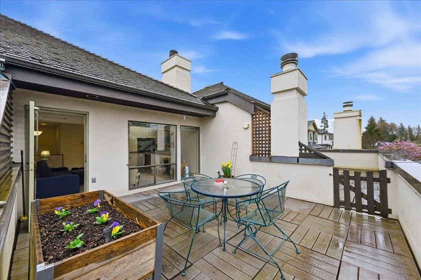 Sun-filled two-bedroom plus den townhome situated in a highly convenient Kerrisdale location. This unique residence features a reverse floor plan, with an inviting bright, skylit living room, dining area, kitchen & powder room, creating an open and airy living space on the upper level. The first level offers two bedrooms, a den/solarium & a full bathroom. Enjoy beautiful southern views from the expansive patio off the living room. Ideally located within walking distance to the shops & amenities of Kerrisdale Village & Elm Park. Convenient access to public transit, including the express bus to University of British Columbia right out of the front door! Close proximity to Kerrisdale Elementary & Crofton House Schools. Includes 1 parking stall & 1 storage locker. Open House April 11, 2-4pm.