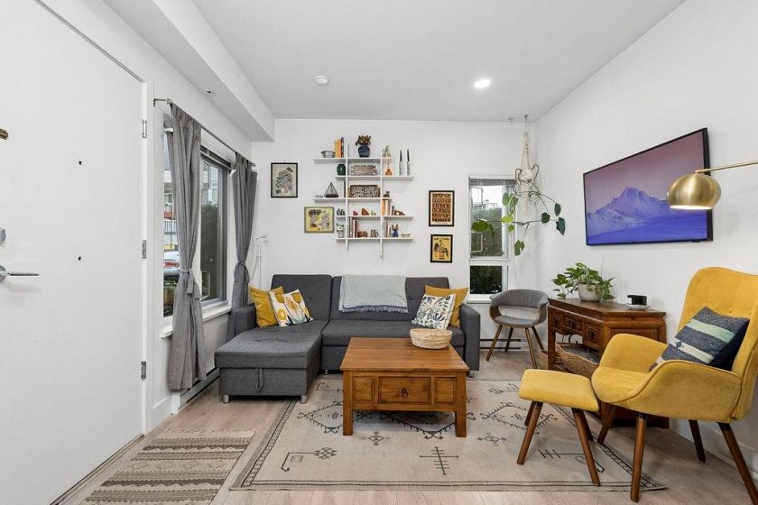 Welcome to Slocan Park! This wonderful corner unit boasts 3 bed, 2 bath+ storage combining comfort, flexibility, and modern design. Enjoy a private rear entrance tucked away from street noise for added peace and quiet. One of the bedrooms can easily be converted into a legal bachelor suite, complete with its own entrance, bathroom, and kitchenette—perfect for rental income or extended family. This home offer features quartz countertops, stainless steel appliances, ample kitchen storage, and wide-plank laminate flooring throughout. Step outside to enjoy two private patios, with windows oriented to the southwest and southeast for plenty of natural light. Ideally situated just steps from parks, restaurants, transit and grocery stores.