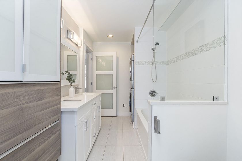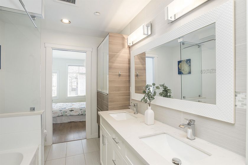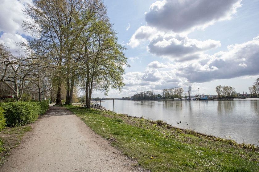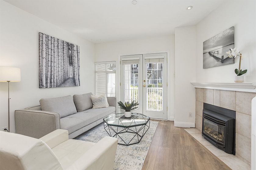 Welcome to popular Lighthouse Terrace! 3 level, 3 bedroom & 3 bathroom townhome. Spacious open floorplan. White Kitchen w/ quarts countertops & breakfast bar, Living/ Dining room combo w/ gas fireplace & french doors out to patio & grassy courtyard. Upper has 2 good size bedrooms, updated bath w/ double sinks & laundry. Primary bedroom retreat on the top level w/ vaulted ceilings, ensuite w/ separate shower & tub and bonus private balcony. Steps to the Fraser River, Riverfront Park, a scenic walkway along the river & the River District w/ Save-On-Foods, Starbucks plus more shops, parks & natural spaces. 2 side by side parking stalls & storage locker. Wonderful family complex. Move in today.