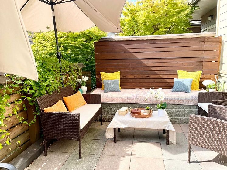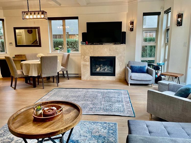Priced to sell Walking distance to Shipyard , While many townhouses feel more like condos, this home truly lives like a house—featuring your own private street-level with no need to pass through the complex. Sun-drenched wraparound south-facing terrace with natural light throughout. 3 bdrm and 3 bath , all bedrooms are located on the same level, each with large closets. The primary suite includes a private ensuite bath. Downstairs, enjoy a large recreation room complete with a built-in queen-size Murphy bed – perfect for guests or your fourth bedroom. Upgraded German waterproof laminate flooring , Miele dishwasher and LG fridge. 2 underground parking stalls . 1 Storage - Great complex and a healthy C-fund , low strata fee- High Ceiling 9'4 bright, open, and airy feel. By appointment